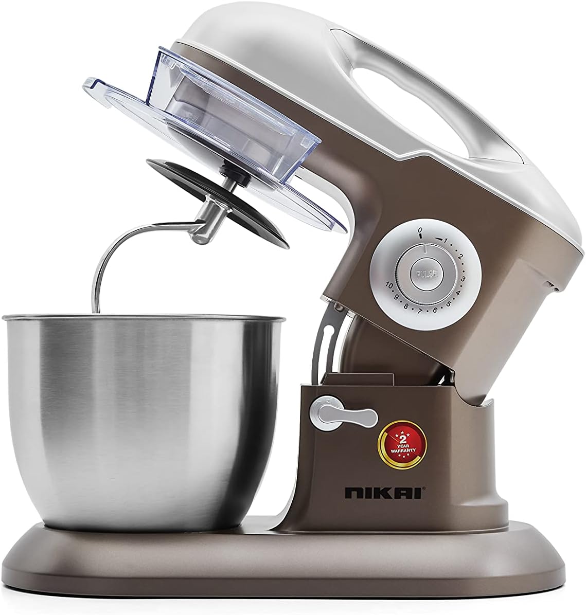 خلاط عامود 1000 واط من نيكاي 6.5 لتر – خطاف عجين، خفق عجين، فضي