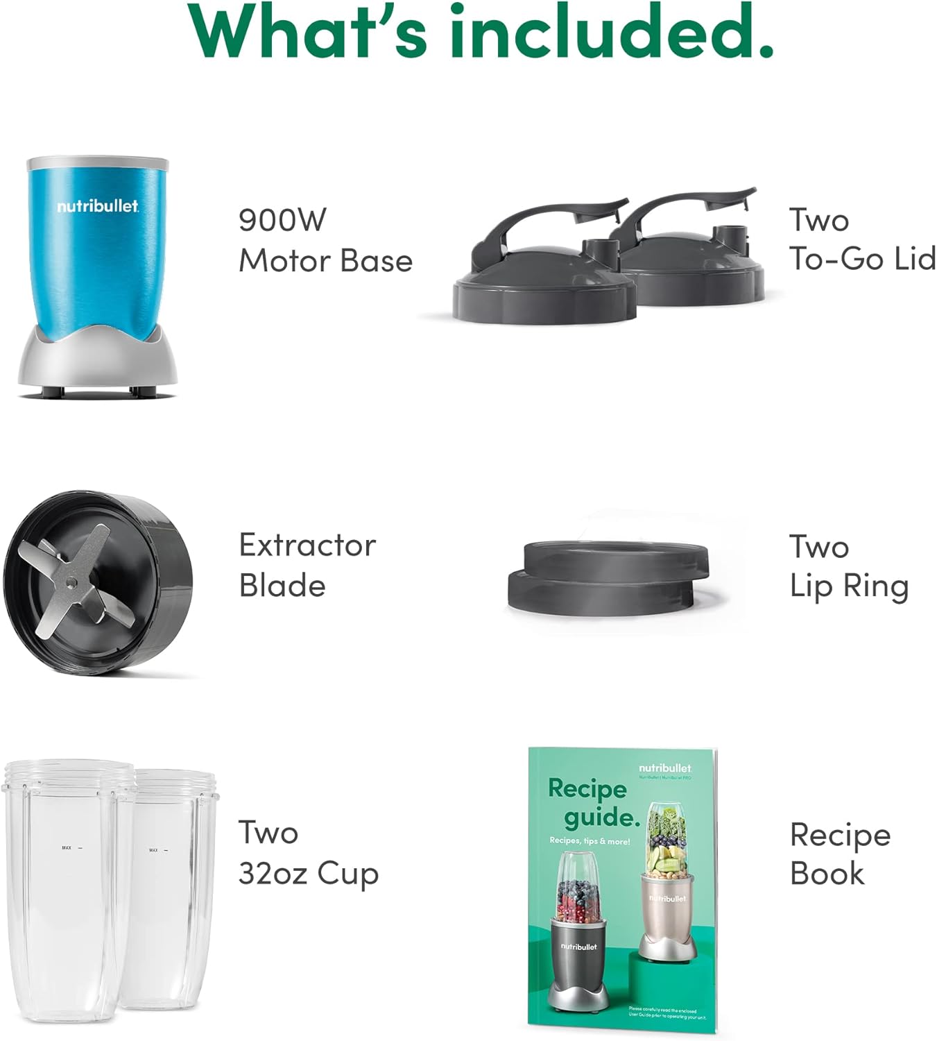 تشتمل على: (1) قاعدة محرك 900 وات، (1) شفرة مستخرج، (2) كوب 346 أوقية، (2) غطاء للتحريك، (2) حلقة شفاه، (2) حلقة شفاه بمقبض وكتاب وصفات.