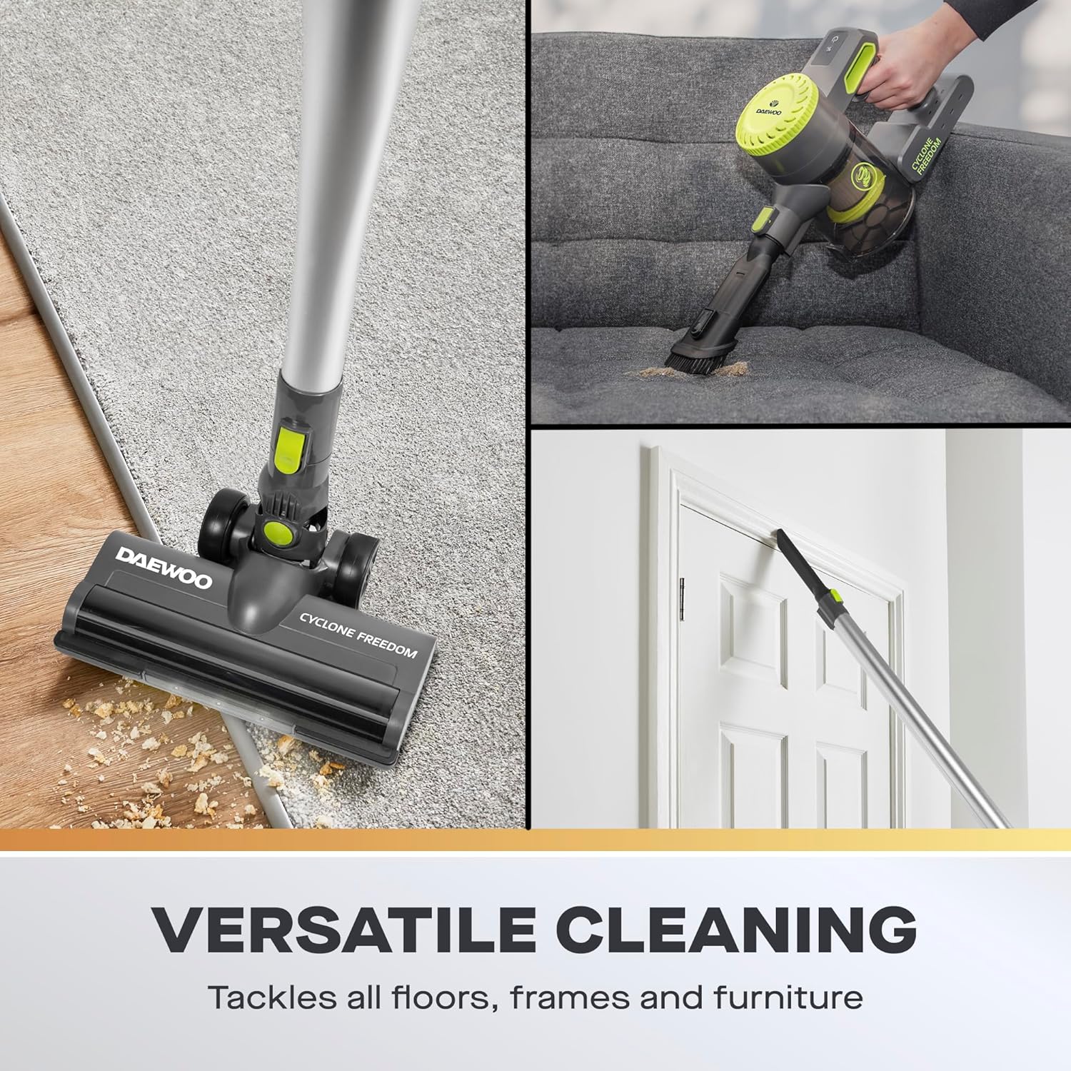مكنسة دايو Cyclone Pro لاسلكية ومحمولة باليد. تتميز الماكينة بقدرة 150 واط بخزان غبار سهل التفريغ 0.8 لتر. تتميز المكنسة الكهربائية بوقت تشغيل 35 دقيقة ويمكن شحنها بالكامل في أقل من أربع ساعات. تستخدم المكانس الكهربائية الخاصة بنا الفصل الإعصاري لتفكيك الأوساخ من تدفق الهواء مما يجبر جزيئات الأوساخ على حافة الحاوية، مما يضمن تنظيفًا شاملاً في كل مرة. يأتي المنظف مع أداة للشقوق والتنجيد وفرشاة بشعيرات وبكرة وقاعدة تخزين مثبتة على الحائط والتي تعمل أيضًا كقاعدة شحن.