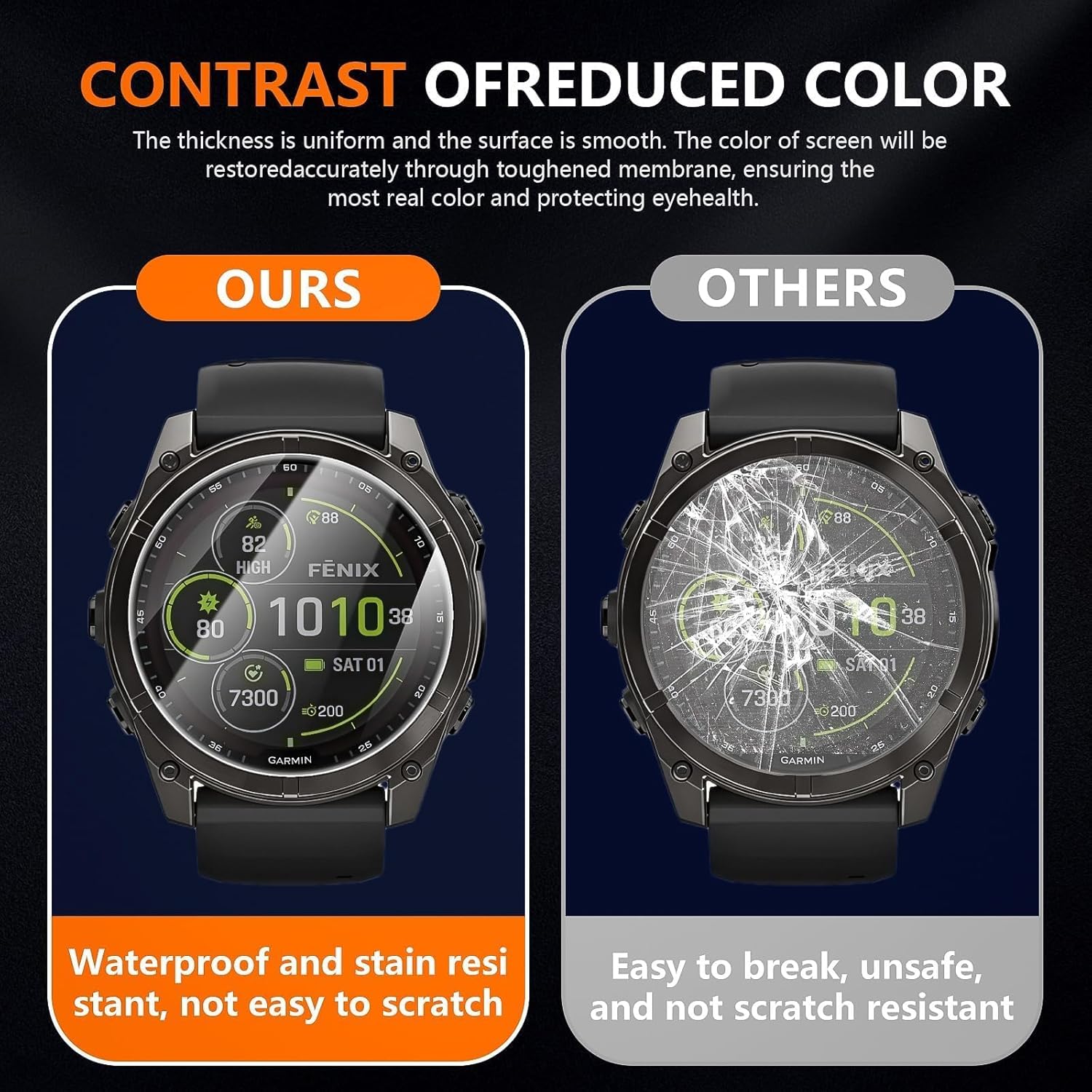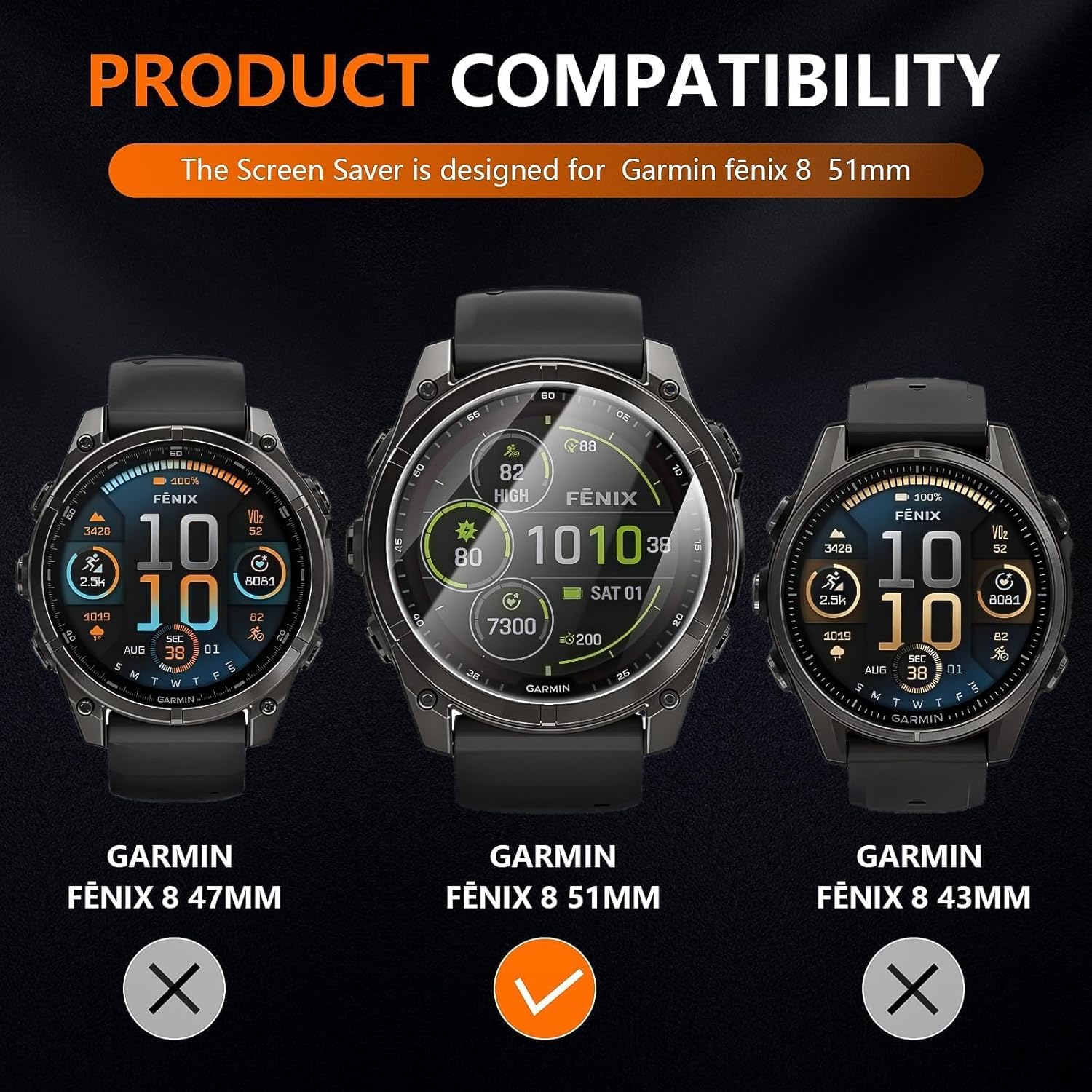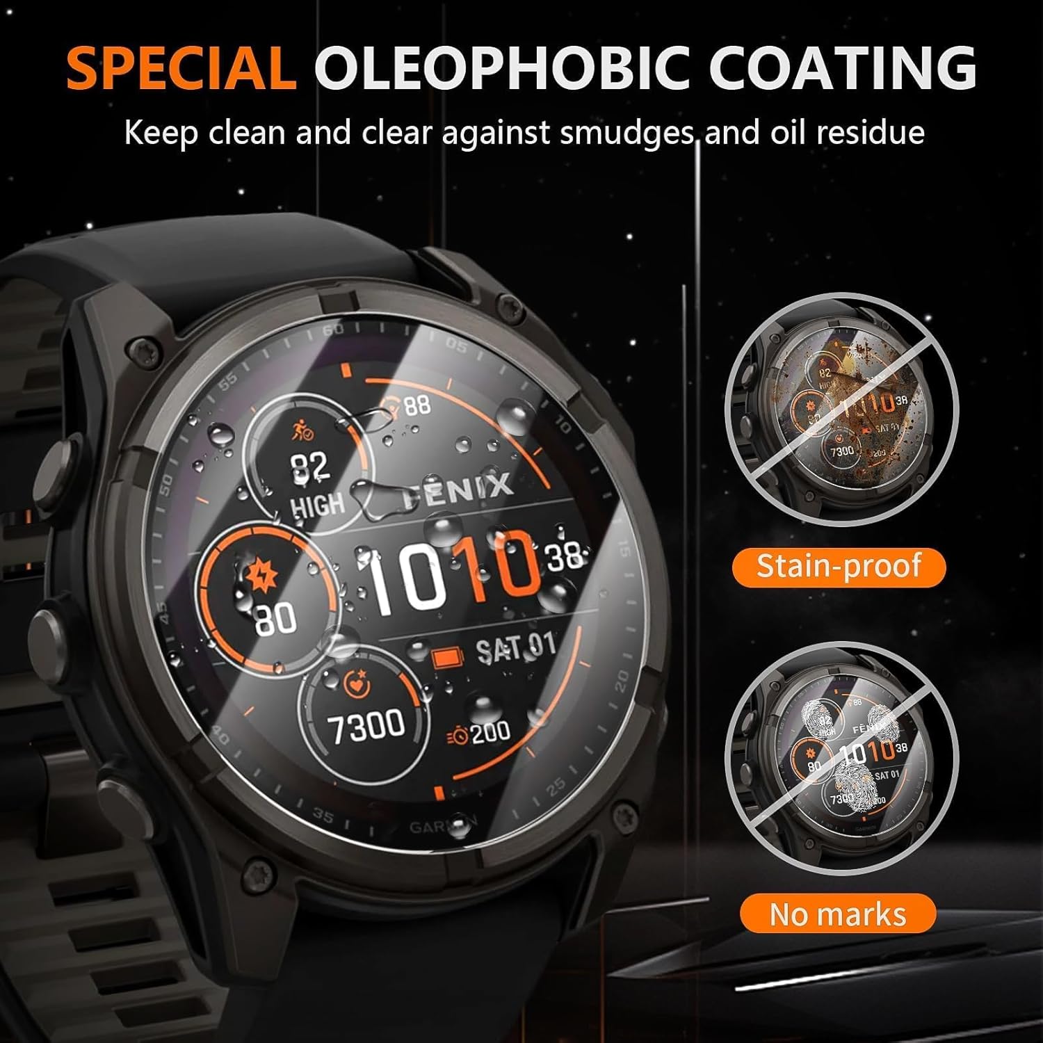 التوافق: تم تصميم غشاء الساعة بزجاج واقي لزجاج جارمين فينيكس 8 51 ملم، يناسب سطح الساعة تمامًا ويوفر حماية كاملة ومثالية للشاشة