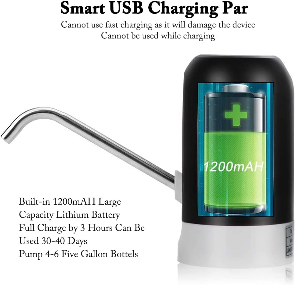 بطارية قابلة لإعادة الشحن بمنفذ USB – موزع مضخة مياه 12 فولت يحتوي على بطارية 1200mAh قابلة لإعادة الشحن. يمكن استخدامها لمدة 30 – 40 يومًا أو ضخ 4 – 6 زجاجات مياه بسعة 5 جالون بمجرد شحنها بالكامل. لا تحتاج إلى الشحن كل يوم.
