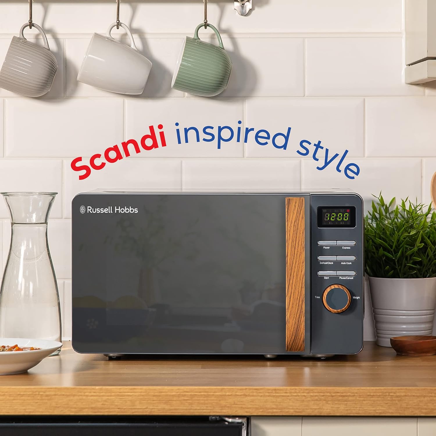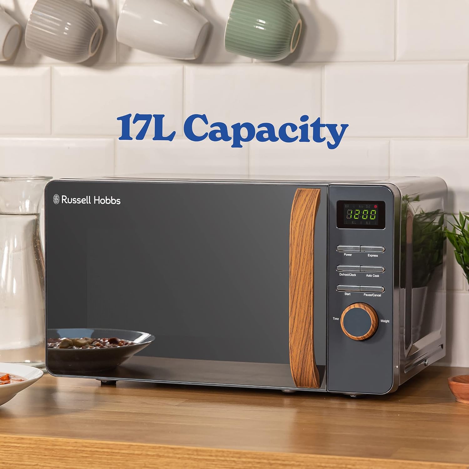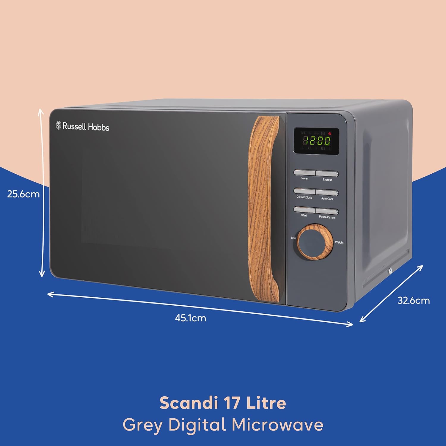 راسل هوبز ميكروويف رقمي RHMD714G سعة 17 لتر 700 واط من سكاندي رمادي مع 5 مستويات طاقة، مقبض واقراص بتاثير خشبي، ساعة ومؤقت، اذابة الثلج التلقائي، سهل التنظيف، 8 قوائم طهي تلقائية
