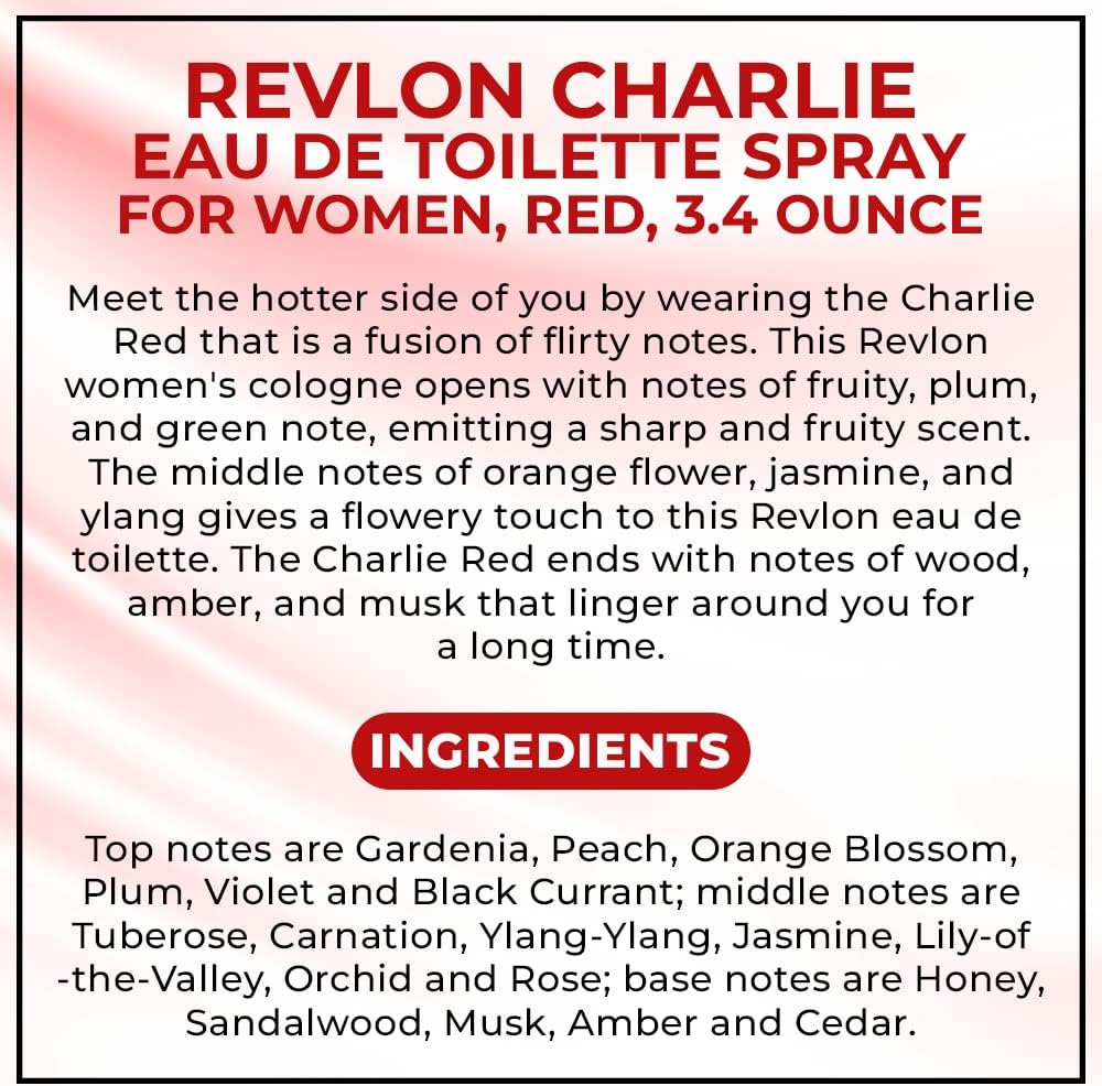 مواصفات المنتج: العلامة التجارية: ريفلون نوع العطر: او دي تواليت الحجم: 100 مل، الفئة المستهدفة: النساء، عائلة العطر: الزهور والفواكه اسم العطر: تشارلي ريد التفاصيل: مقدمة من دار تصميم ريفلون في عام 1993. يحتوي هذا العطر الزهري على مزيج من البنفسج والمشمش الوردي وزنبق الوادي والحمضيات الطازجة والبرقوق. يوصى به للارتداء الكاجوال.