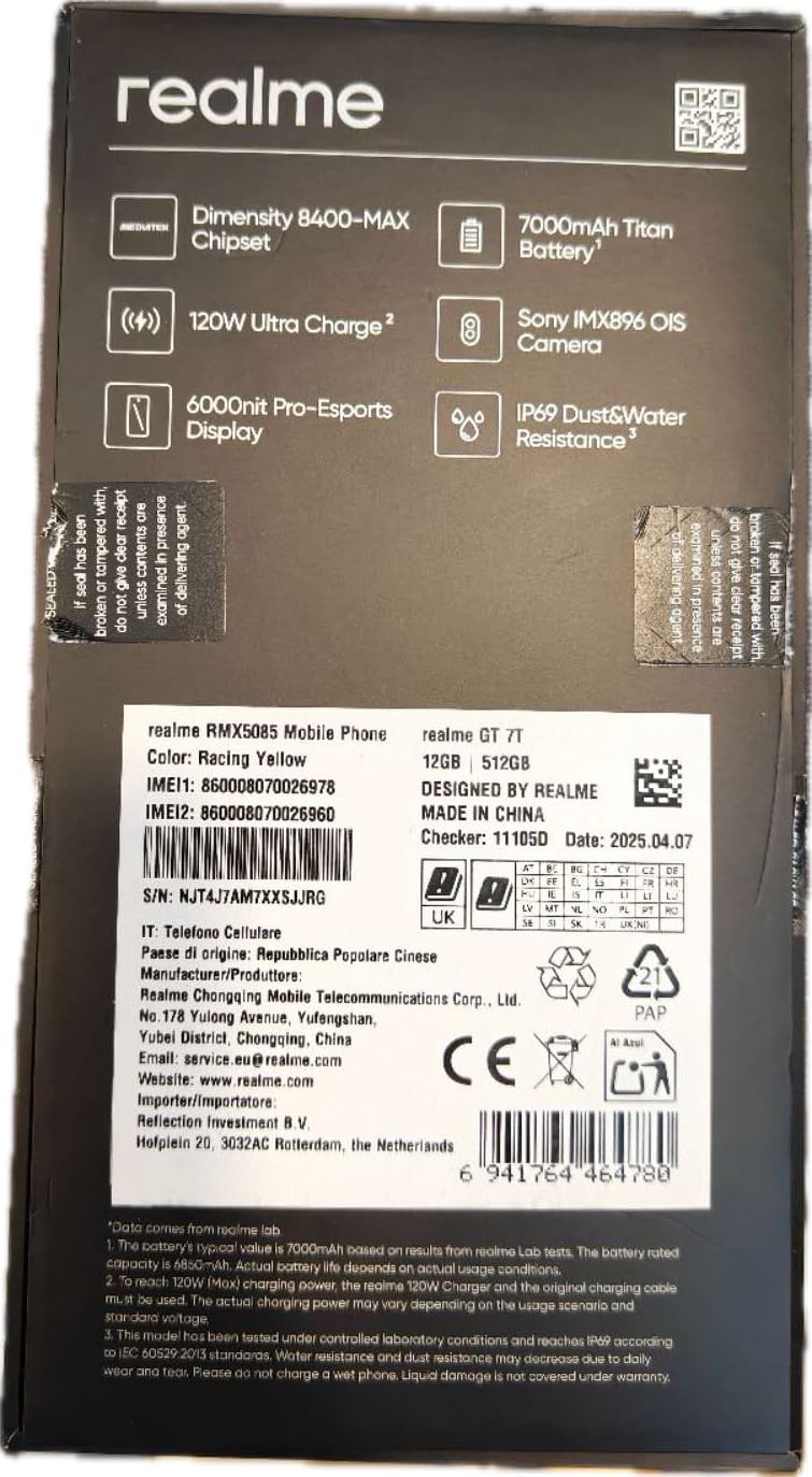 يعمل ريلمي GT 7T بنظام اندرويد 15 ويعمل ببطارية غير قابلة للإزالة بسعة 7000 مللي امبير في الساعة. التردد: متوافق مع شرائح الاتصال الشبكية التي تعمل