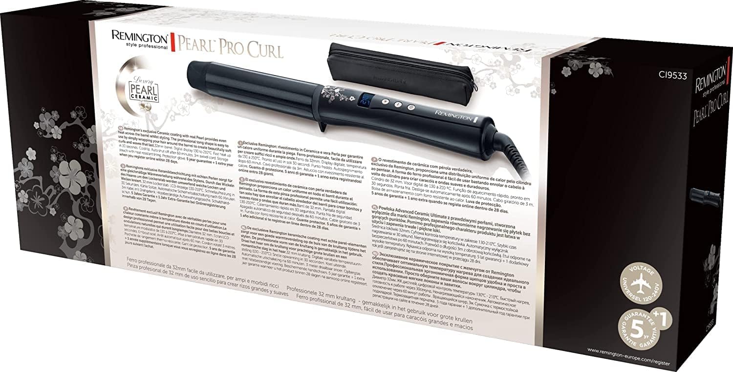 ريمينجتون مكواة تجعيد الشعر رفيعة وسميكة [32 ملم: تجعيد براق] (سيراميك مع رقائق لؤلؤية، حرارة متساوية، 130-210 درجة مئوية، قفاز واقي) مكواة تجعيد الشعر باللون الاسود CI9533