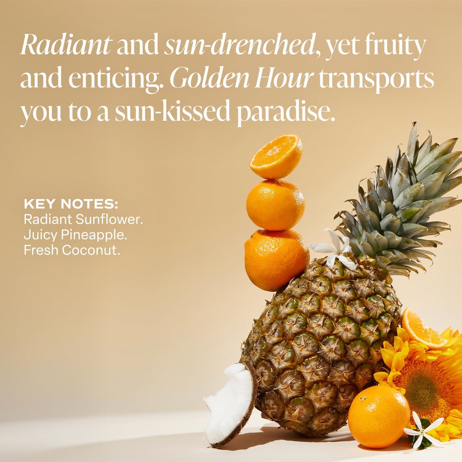 عطر ساعة الذهب: يجمع عطر زهرة عباد الشمس اللامعة والأناناس الغني بالسوائل وجوز الهند الطازج في مزيج استوائي مشرق ومبهج، مليء بالزهور المشمسة والفواكه اللذيذة والدفء الكريمي الشاطئي. تنقلك ساعة الذهب إلى جنة مشمسة جذابة.