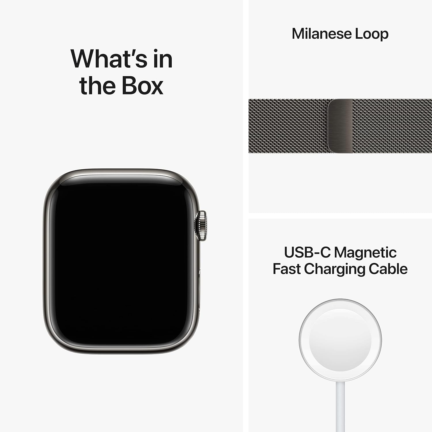 ساعة ابل سلسلة 8 (نظام تحديد المواقع + وظيفه الإتصال الخلوي، 41 ملم) هيكل حديدي مقاول للصدأ بلون رمادي وسوار رياضي بلون سماء الليل – مقاس عادي