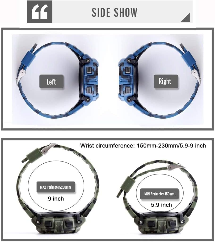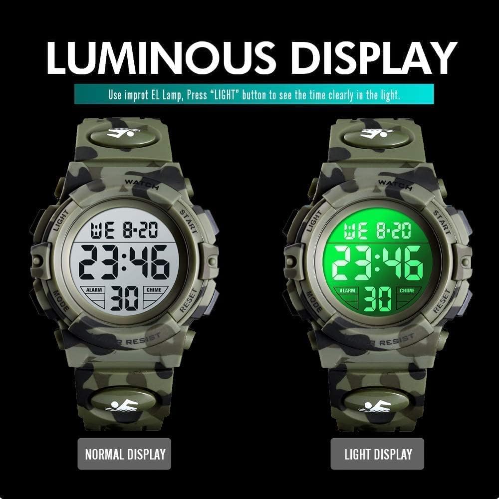 Fashionable children’s digital watch, high-quality movement with Japaness battery providing accurate time.The compact watch combines various functions in a weekly / month display, alarm, calendar, stopwatch, hourly hour, 12/24H format selectable, simple operation, let the children experience.164 feet / 50 meters waterproof, daily waterproof, rainy days, hand washing, cold water bathing, short-term contact with water is not a problem.PU material strap with stainless steel buckle, can be adjusted to the size, so that the watch is more firmly fixed on the wrist, children will not fall off easily.Good Christmas present for your children and relatives and friends who like sports.
