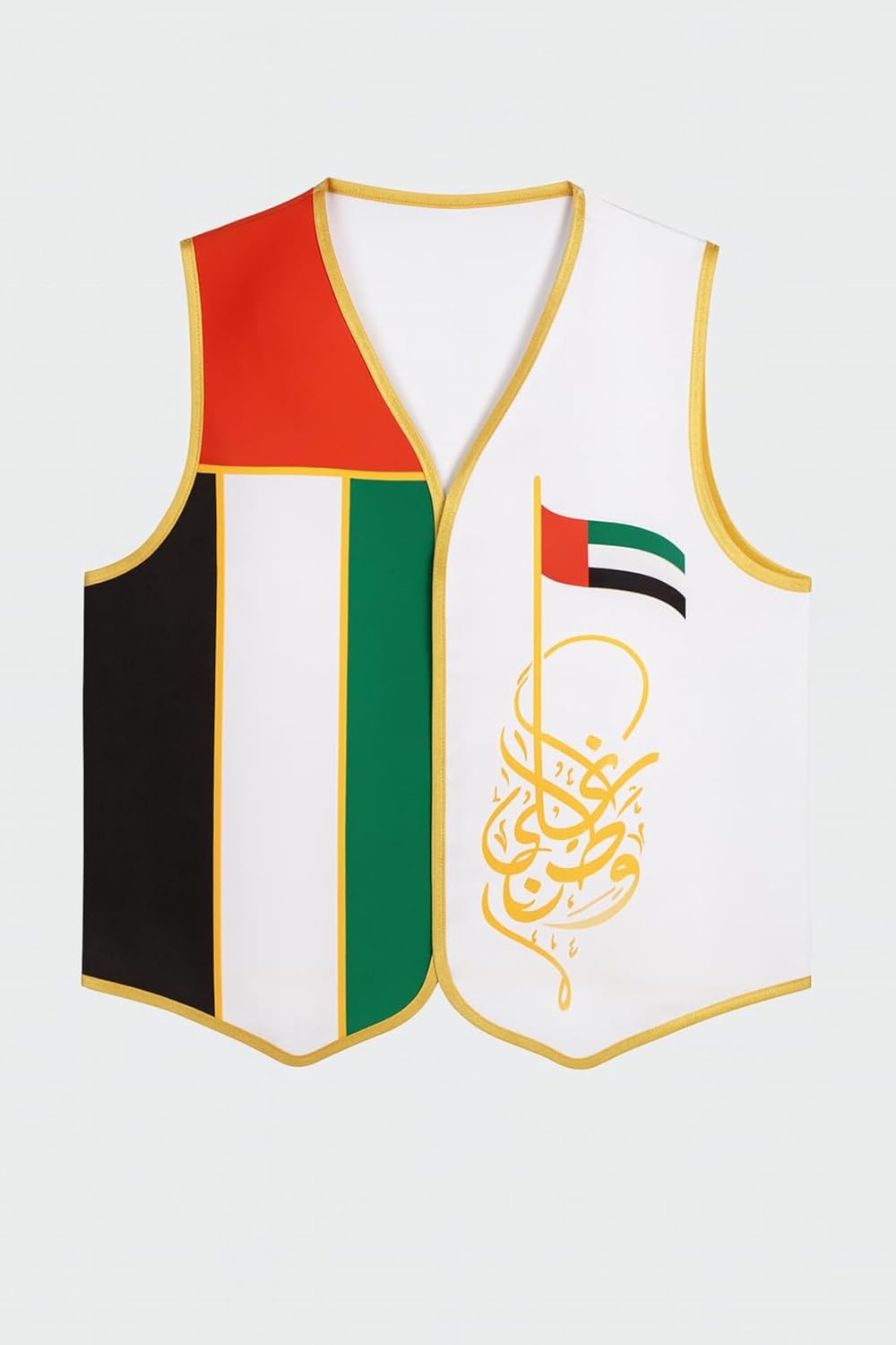 احتفل بروح الإمارات العربية المتحدة مع هذه السترة الاحتفالية المذهلة التي تجسد فخر الأمة وتراثها بشكل مثالي. يتميز التصميم بألوان أيقونية لعلم الإمارات العربية المتحدة – الأحمر والأخضر والأسود والأبيض – مرتبة بأناقة في ألواح عمودية تكملها تفاصيل زخارف ذهبية متطورة. زخرفة الخط العربي الجميل وعلم الإمارات المصغر يزينان السترة، مما يضيف لمسة ثقافية أصيلة. هذا المعطف متعدد الاستخدامات مناسب لاحتفالات اليوم الوطني أو المناسبات الثقافية أو أي مناسبة وطنية. يوفر التصميم بدون أكمام حركة مريحة مع الحفاظ على مظهر أنيق. مثالية لجميع الأعمار والأجناس، هذه السترة بمثابة طريقة أنيقة لإظهار الفخر الوطني. تخلق قصة الرقبة على شكل حرف V والفتحة الأمامية صورة ظلية جذابة، بينما تضمن الحرفية الممتازة المتانة للاحتفالات المتعددة. سواء كانت مقترنة بالملابس التقليدية أو الملابس المعاصرة، فإن هذه السترة تمثل انطباعًا مذهلاً عن التراث الإماراتي.