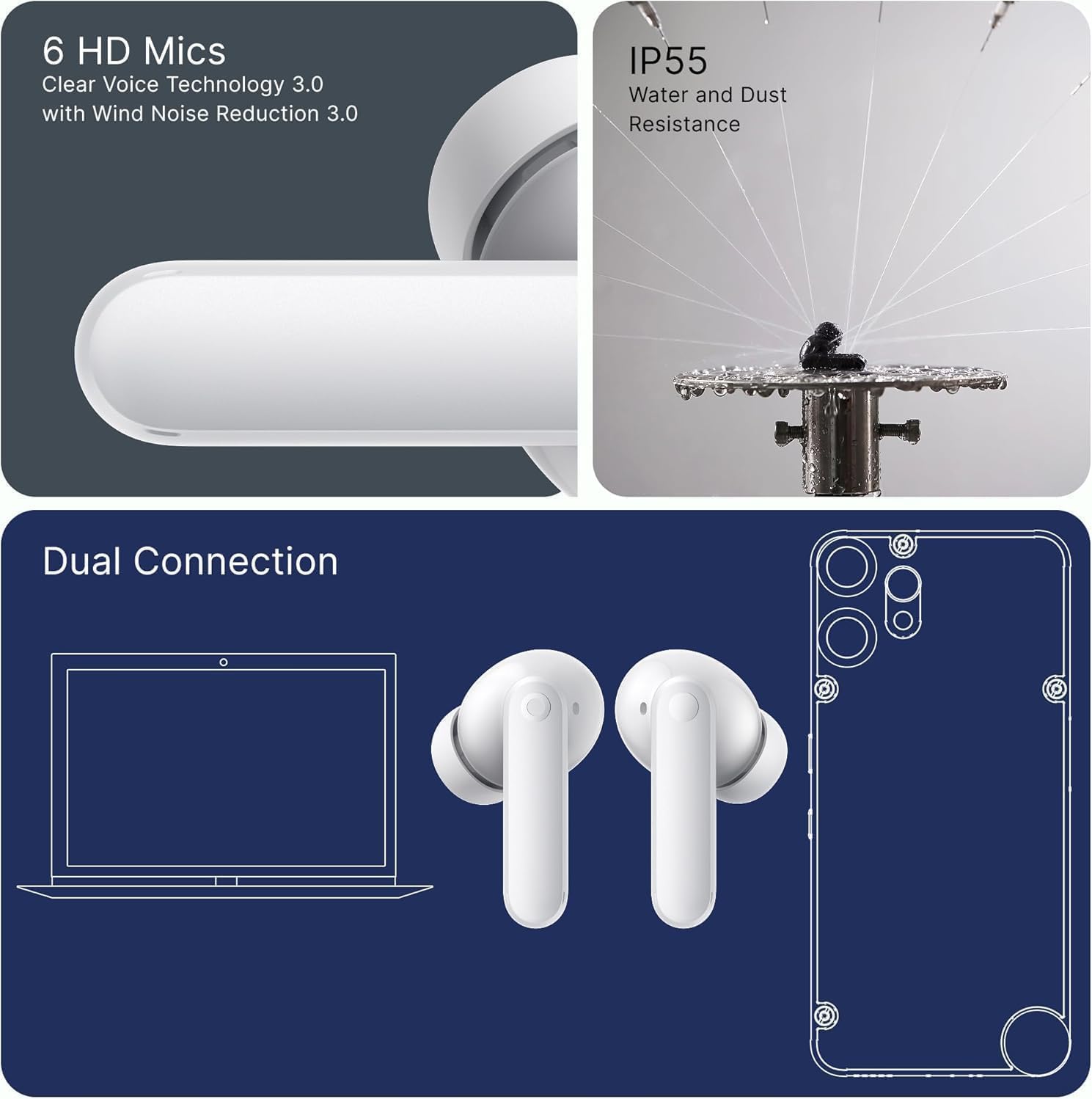 سماعات أذن بلوتوث مع ميكروفون يتحكم في كل بيئة. 6 ميكروفونات عالية الدقة تعمل بتقنية كلير فويس 3.0 وخوارزميات الضوضاء المدربة بالذكاء الاصطناعي تضمن إجراء مكالمات واضحة في رياح 120 كم/ساعة أو مترو الأنفاق المزدحمة. يستخدم نظام تقليل ضوضاء الرياح 3.0 نمذجة صوت 360 درجة لعزل الكلام – مما يجعل سماعات الأذن المثالية للتمارين الرياضية لعشاق الهواء الطلق وعشاق اللياقة البدنية.