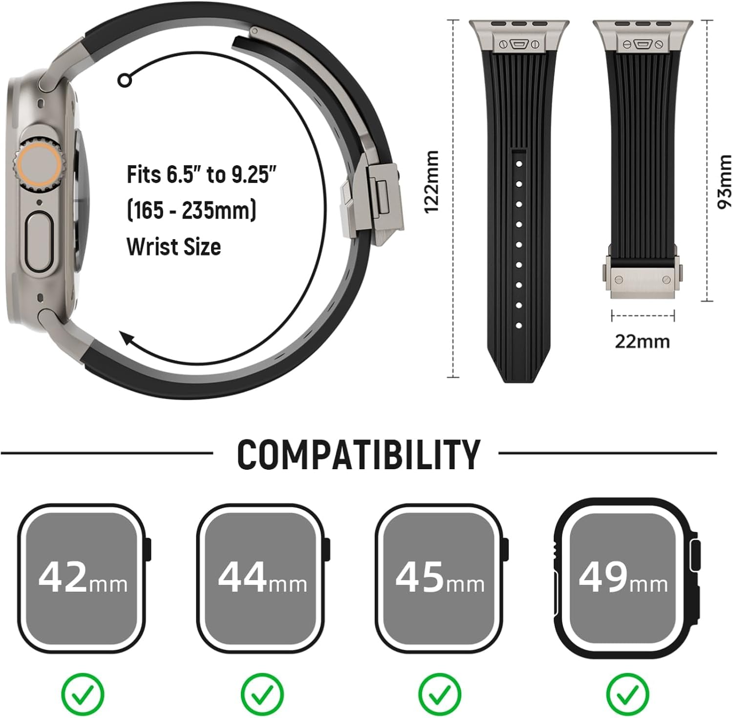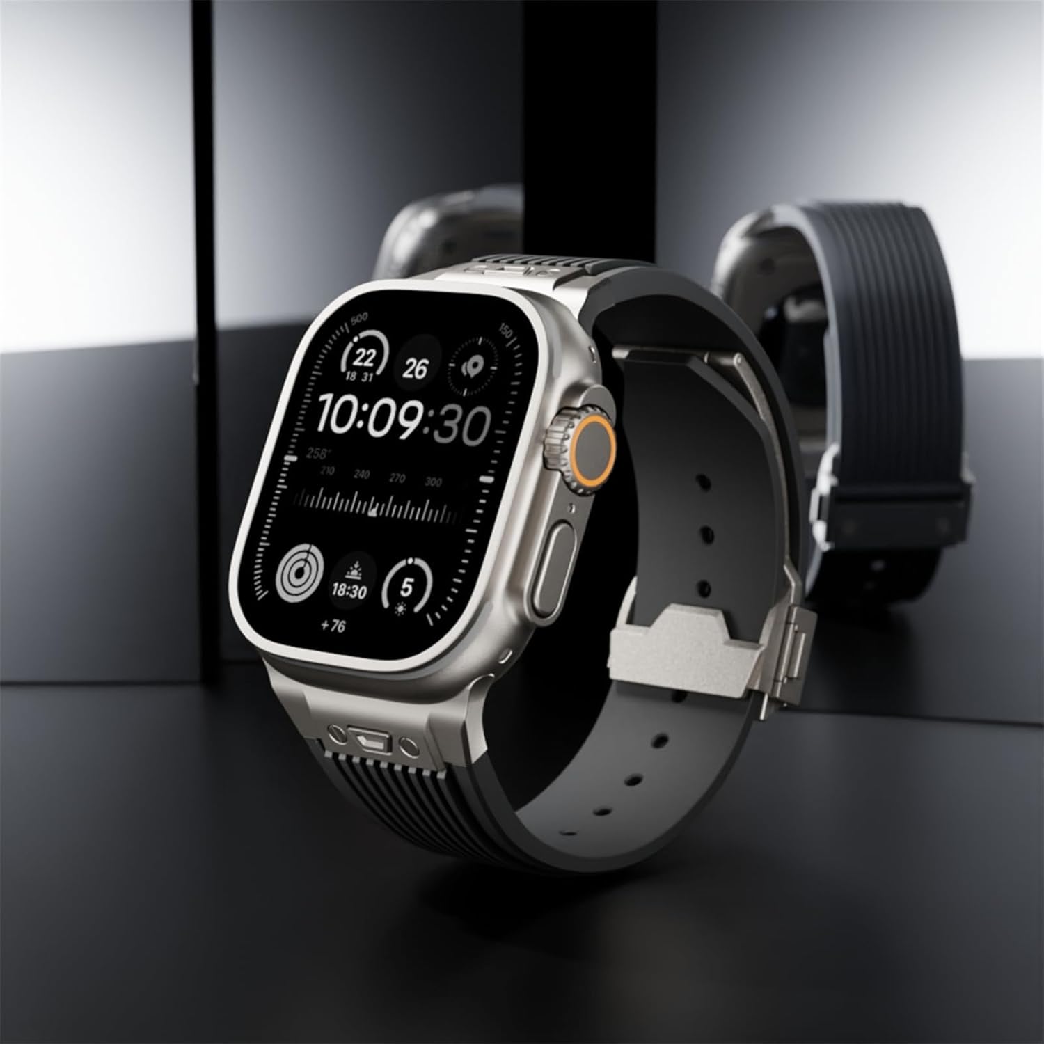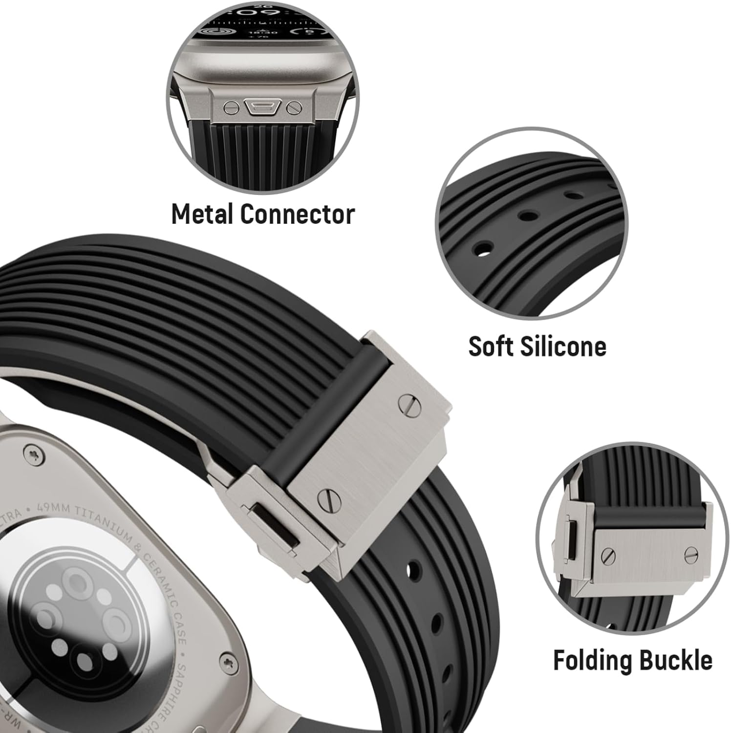 سوار ساعة لساعة ابل الترا 2 49 ملم 46 ملم 45 ملم 44 ملم، سوار مطاطي من السيليكون المتين الفاخر للرجال مع موصل معدني ومشبك قابل للطي لسلسلة اي ووتش 10 9 8 7 6 SE