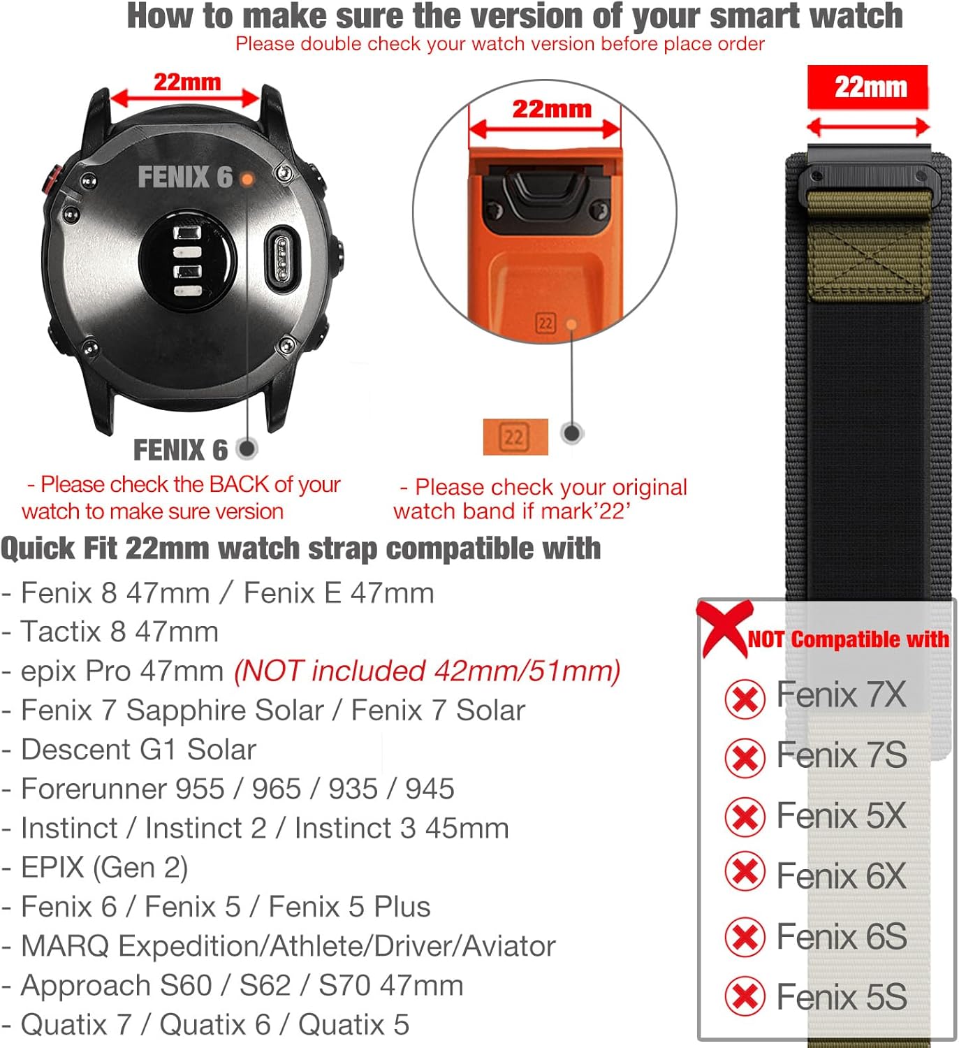 — يرجى التحقق من سوار الساعة الأصلي إذا وضعت علامة “كويك فيت 22 ملم”، وإذا كان الأمر كذلك، فإن سوار الساعة يناسب ساعتك الذكية.