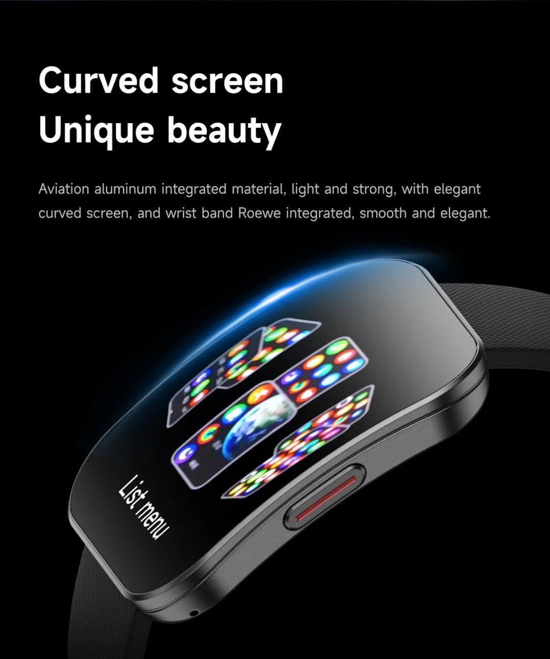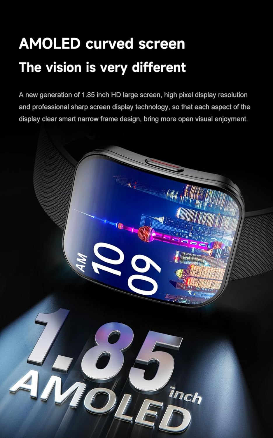 1️⃣ تصميم شاشة منحنية رفيعة للغاية جرب شاشة زجاجية منحنية ممتازة مع هيكل نحيف وأنيق. توفر شاشة اللمس الكاملة HD مقاس 1.7 انش ألوانًا نابضة بالحياة وتنقلًا سلسًا، مما يجعلها تبدو وكأنها ساعة ذكية فاخرة.
