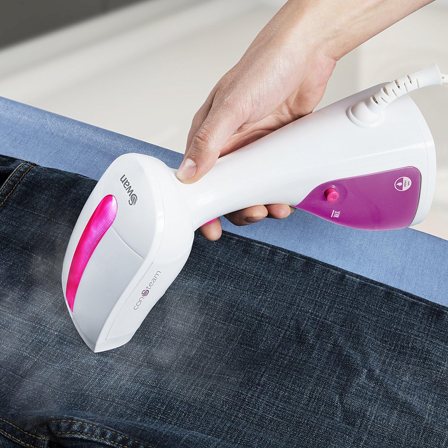 سوان مكواة بخار للملابس SI12020N محمولة باليد، خفيفة الوزن، فرشاة قماش قابلة للازالة، كيبل طاقة بطول 1.9 متر، 1100 واط، خزان مياه 250 مل، ابيض وزهري