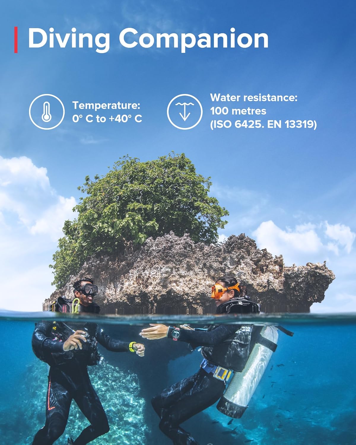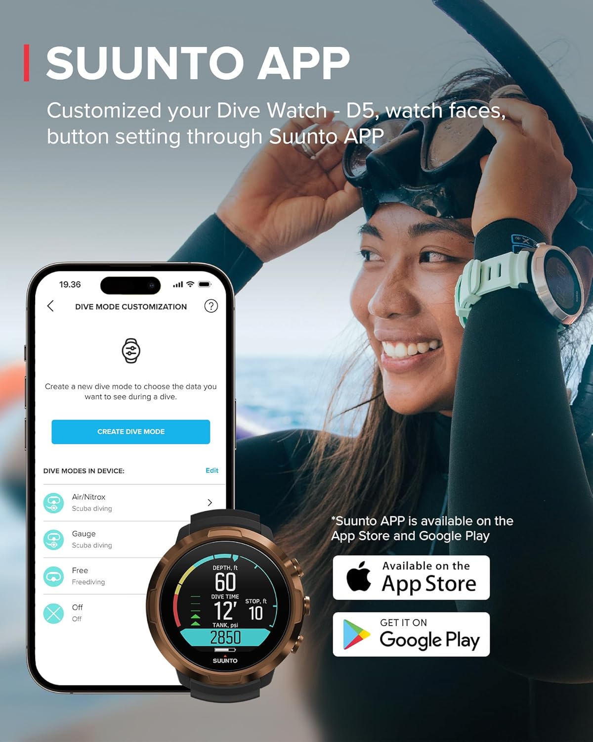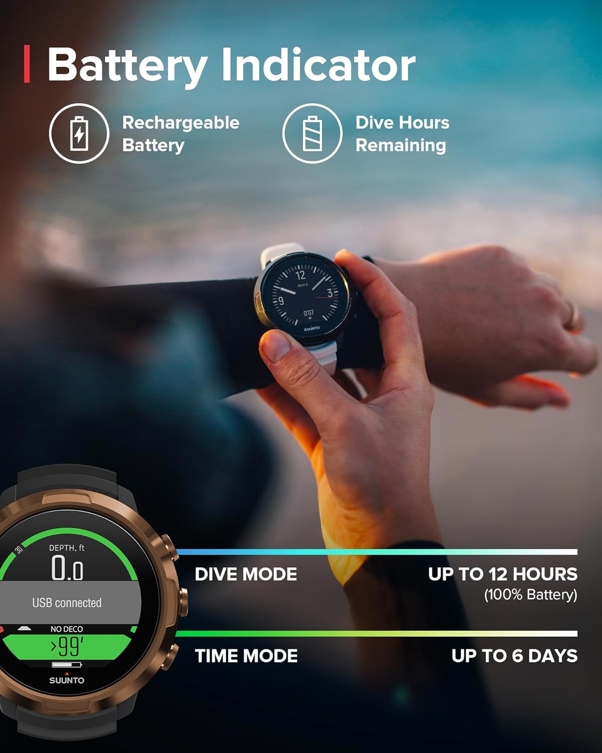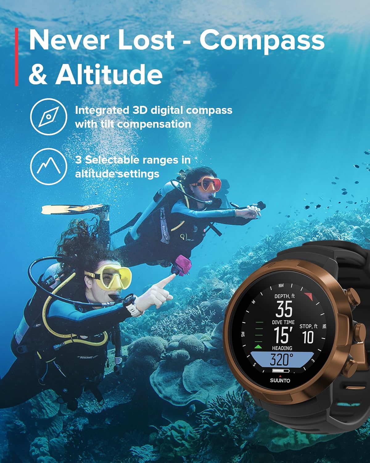 تم تصميم جهاز سوونتو D5 الجديد ليكون واضحًا للغاية وسهل الاستخدام بحيث يمكنك فقط الاستمتاع والتركيز على استكشاف العالم الرائع تحت الماء. العبي بأناقة عن طريق تغيير السوار ليتناسب مع مظهرك. بعد الغوص، قم بتوصيله لاسلكيًا بتطبيق سوونتو لإعادة العيش ومشاركة مغامراتك مع الأصدقاء.
