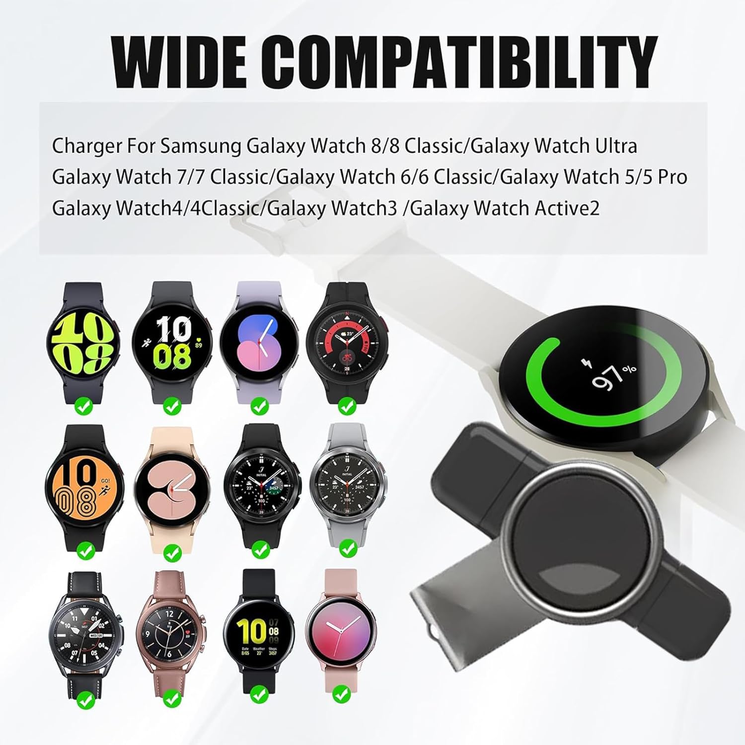 【شاحن ساعة ذكية مطور لساعة سامسونج】هذا الشاحن المحمول متوافق مع ساعة سامسونج جالكسي 7/جالكسي ووتش الترا/6/6 كلاسيك/5/4/5 برو/4 كلاسيك/جالكسي ووتش 3/جالكسي اكتيف 2/جالكسي اكتيف. يدعم شاحن الساعة جميع ساعات سامسونج إلى أقصى حد، حيث يقوم بتحديث وترقية رقاقة الشحن تلقائيًا
