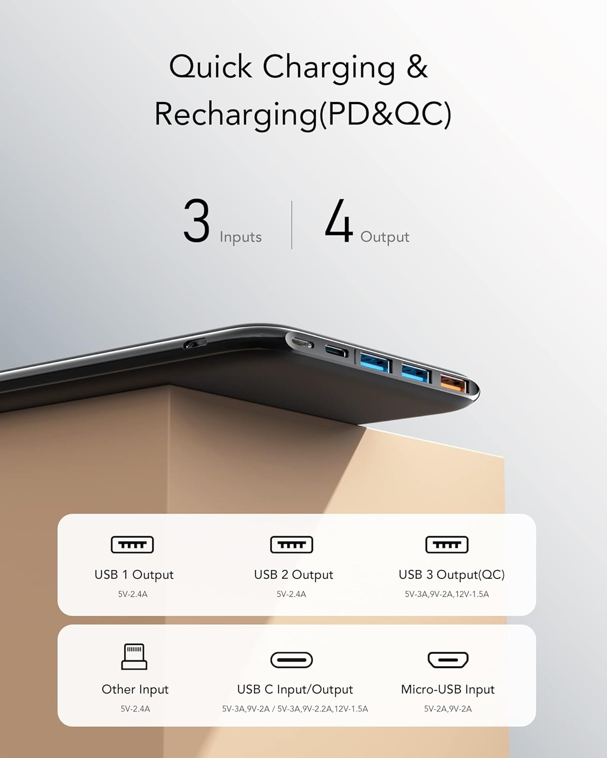 ⚡【شحن عالي السرعة】: بطارية إعادة شحن كاملة لمدة 7 ساعات بواسطة شاحن كيو سي/بي دي 3.0؛ يحتوي على منفذي USB قياسيين ومنفذ شحن سريع ومنفذ USB-C يسمح لك بشحن أجهزة متعددة في وقت واحد، وستكتشف منافذ اي سمارت هذه الأجهزة وتضبطها لإعدادات الشحن المثلى. منفذ شحن سريع 3.0 يشحن الأجهزة المتوافقة حتى 80% في 35 دقيقة، مما يوفر جهد 5 فولت 9 فولت 12 فولت شحن قابل للتعديل بذكاء لأجهزة كيو سي 3.0 المختلفة، أسرع 4 مرات من الشحن التقليدي
