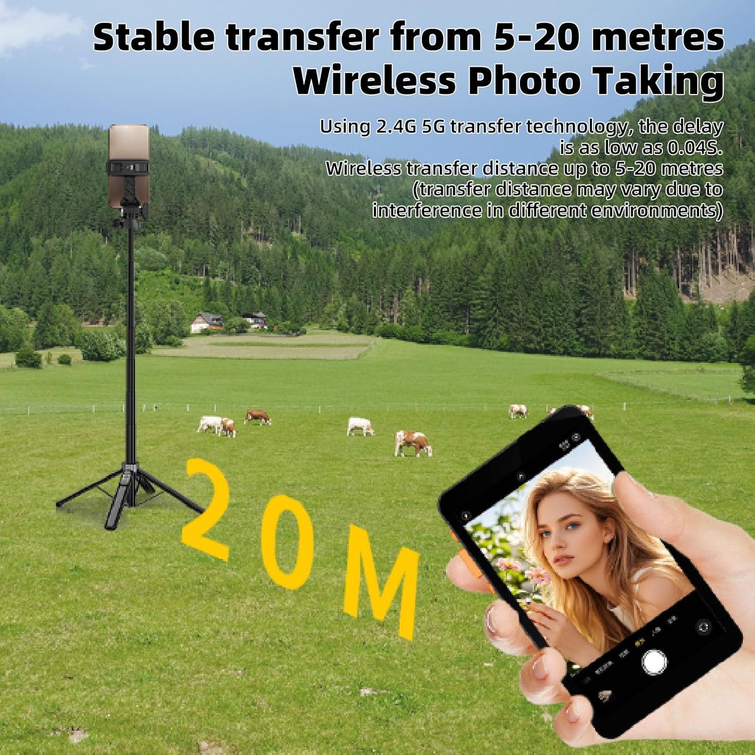 واي فاي لاسلكي: باستخدام تقنية الواي فاي اللاسلكية المتقدمة 2.4G و5G، يوفر هذا الجهاز وقت استجابة منخفض بشكل مثير للإعجاب يبلغ 0.04 ثانية فقط. مع نطاق لاسلكي من 5 إلى 20 مترًا (يعتمد على العوامل البيئية)، فإنه يدعم كلاً من معايير اير بلاي وميراكاست، مما يتيح مزامنة سلسة لشاشات iOS وAndroid مع الشاشة.