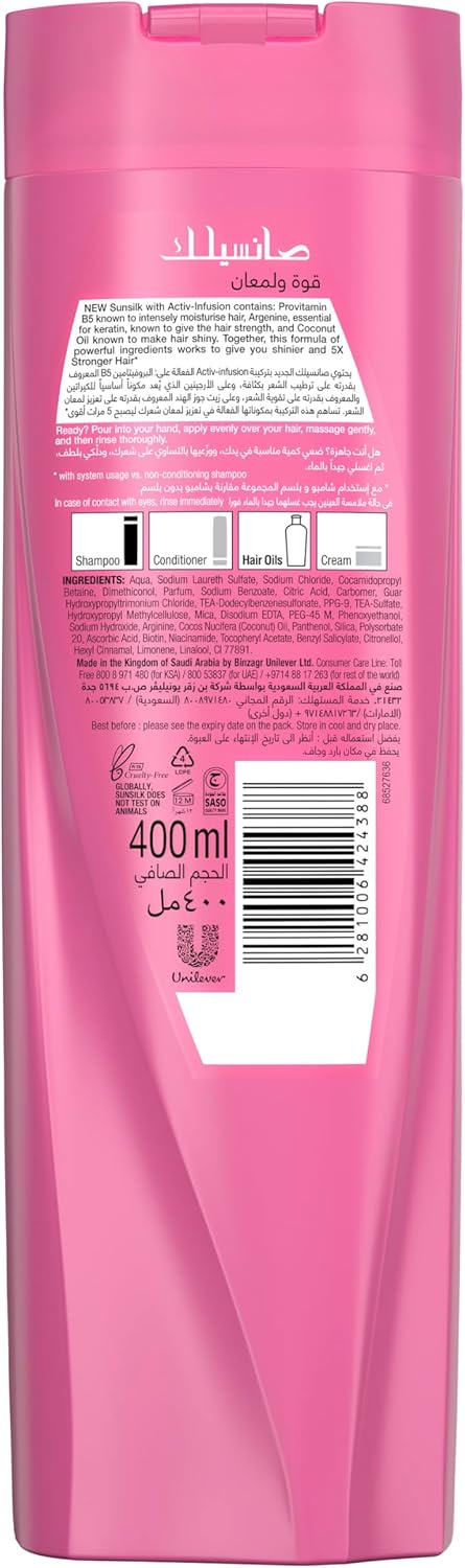 انهضي وتألقي. يتميز شامبو صانسيلك للقوة واللمعان اكتيف-انفيوجن بتركيبة فريدة تقوي كل ألياف الشعر للحصول على شعر صحي المظهر وقوي مع لمعان طبيعي. هذه التركيبة الحصرية بتكنولوجيا نيوتري شاين، تغطي كل خصلة بسلاسة، تاركة شعرك قويًا ولامعًا بشكل لا يصدق* من الخارج. مزيج فريد من نوعه من برو-فيتامين B5 والأرجينين وزيت جوز الهند يرطب الشعر الجاف بعمق. لذلك أنت تمتلك شعرًا دائمًا على جانبك. يجعل هذا الشامبو شعرك مرنًا ويساعد على حمايته من التلف اليومي. كل ثانية هي فرصة لعيش الحياة على أكمل وجه. نريد أن نكون جميلين عندما نفعل ذلك، أليس كذلك؟ طبيعي، ونابض بالحياة ومليء بالألوان والروائح، صانسيلك تدعمك في كل خطوة على الطريق. في عالم نابض بالحياة ومتغير باستمرار، يُمكننا الاحتفال بكل تحدٍ بشعر محمي ومُصلح ومُقوى ومُعتنى به جيداً. مع ما يقرب من 200 عام من الخبرة الاحترافية في كل زجاجة، سواء كانت لمعالجة الشعر المجعد أو تعزيز كثافة الشعر أو القضاء على التلف أو فرد الشعر أو تنعيمه أو حماية لونه، يمكنكِ الاعتماد على صانسيلك لتحقيق أهدافِك التي تسعين إليها. تصنع صانسيلك منتجات للشعر سوف تستمتع بتجربتها واستكشافها واستخدامها واكتشافها. مع وجود صانسيلك معك، ارتقي بتصفيف شعرك إلى المستوى التالي. *مع استخدام شامبو وبلسم قوة ولمعان مقارنة بالشامبو غير المرطب.