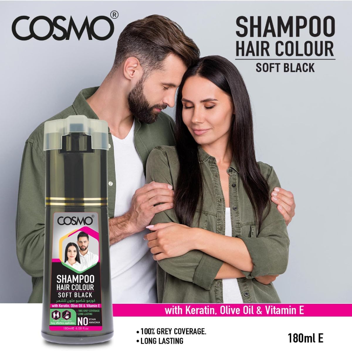 شامبو صبغة شعر سوفت بلاك 180 مل من كوزمو | بالكيراتين وزيت الزيتون وفيتامين E | تغطية 100% للشعر الرمادي | بدون امونيا | بدون بقع | لون شعر يدوم طويلا | للرجال والنساء | صبغة شعر في دقائق