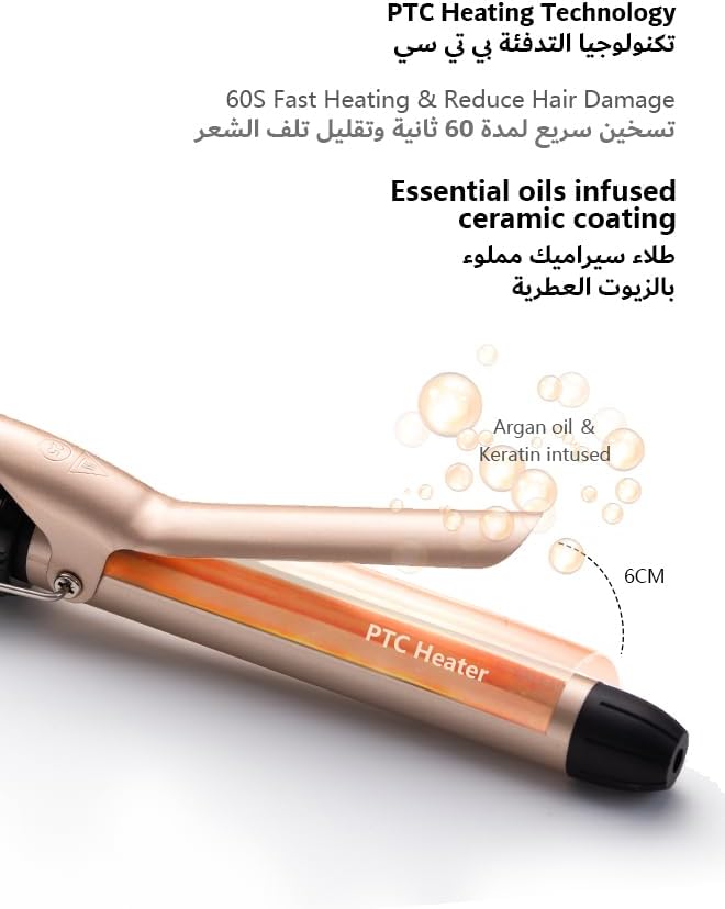 تسخين سريع: تستخدم أداة تجعيد الشعر تقنية التسخين بي تي سي لتسخين حتى 220 درجة مئوية في غضون 60 ثانية لتصفيف فوري وتوفر حرارة متساوية ومتسقة.