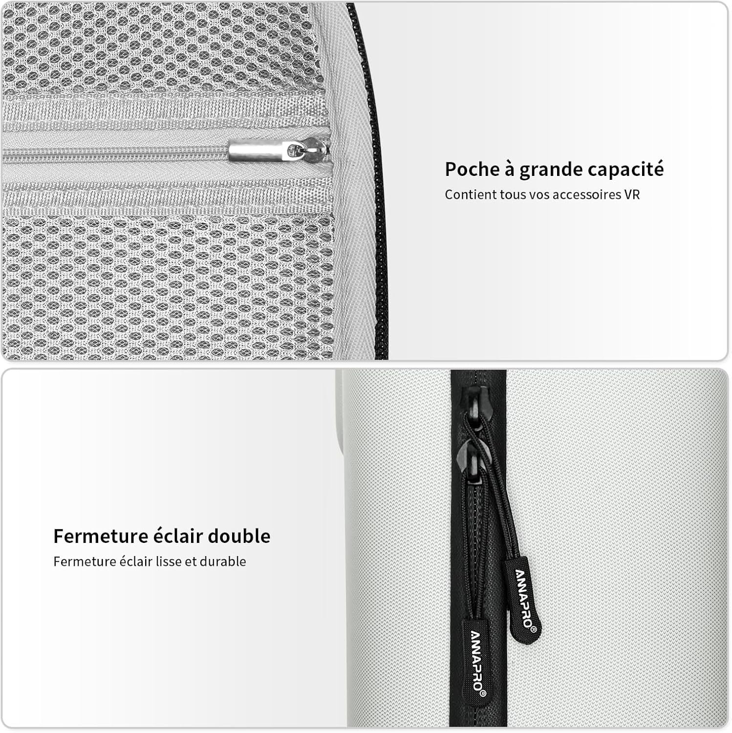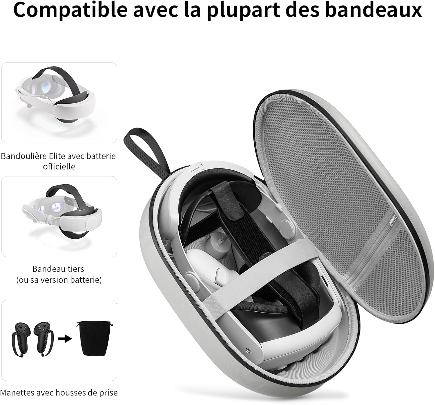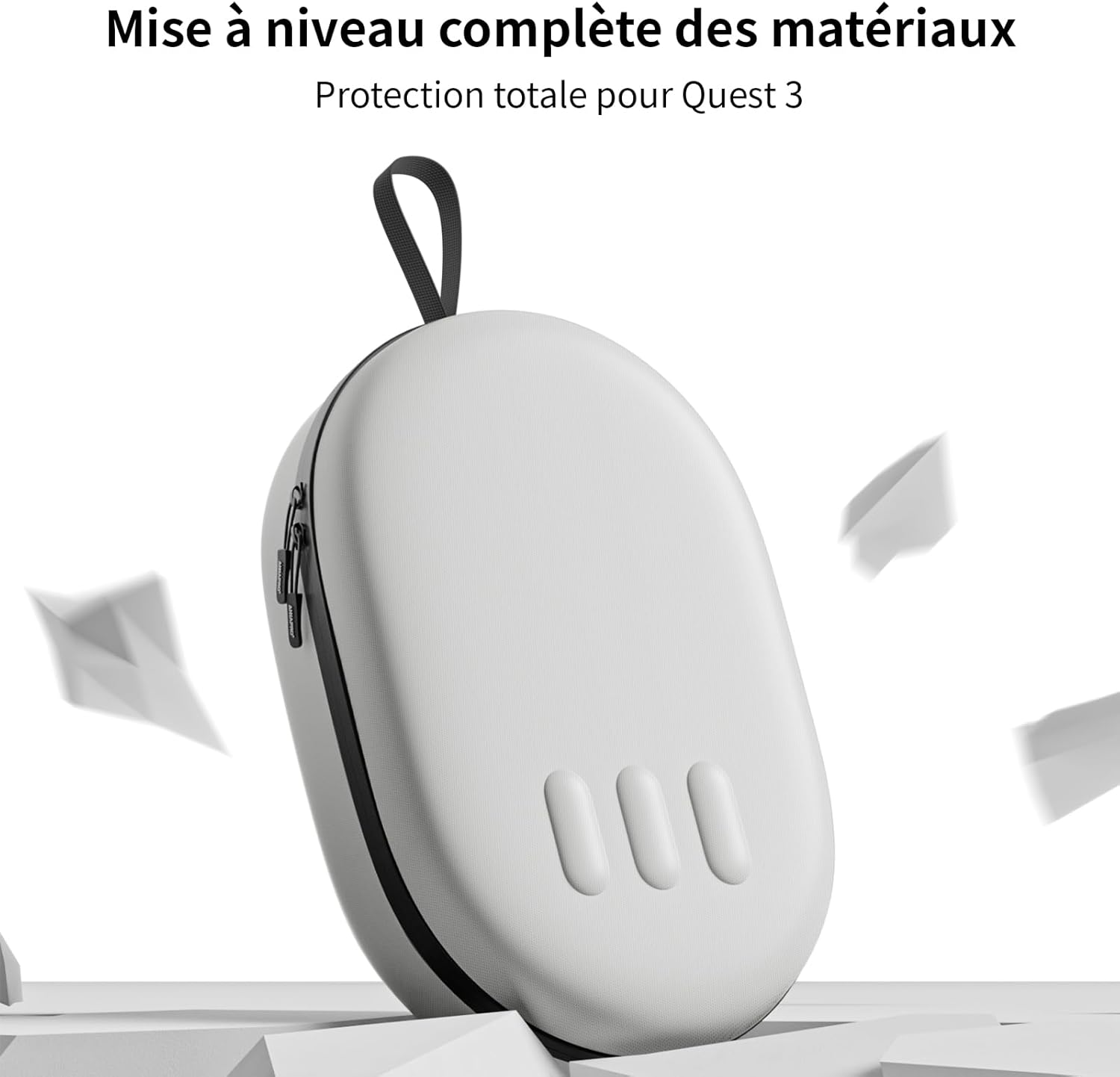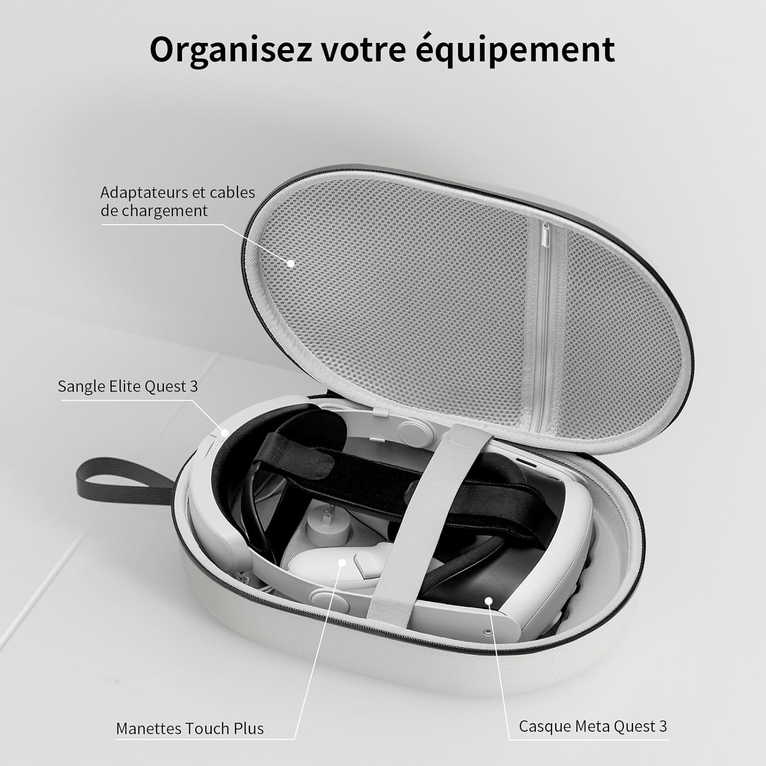 تم تصميم حقيبة الحمل خصيصًا لميتا كويست 3، مع مساحة تخزين واسعة ومنظمة. تتميز سماعات الرأس وأجهزة التحكم باللمس وكابلات الشحن والمحول وشريط الرأس (قياسي أو النخبة) والشريط النشط بمكان خاص في الصندوق. يوفر الجيب الداخلي المزود بسحاب والشريط المطاطي حماية فعالة ضد الصدمات والخدوش.