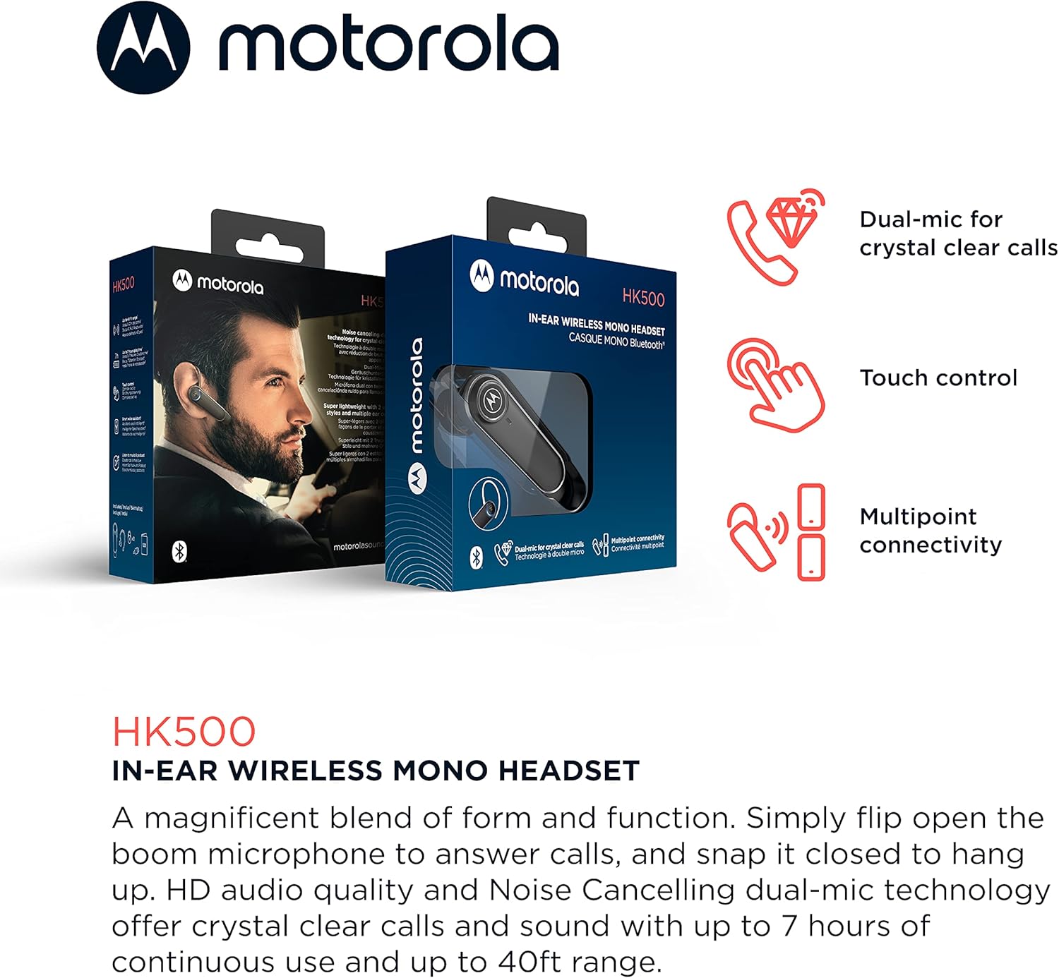 سماعة بلوتوث: سماعة الرأس اللاسلكية موتورولا HK500 هي تماسك رائع بين الشكل والوظيفة. تتيح لك سماعات الأذن متعددة الاستخدامات هذه الرد بسهولة على المكالمات باستخدام الميكروفون المدمج ثنائي التحكم لإجراء مكالمات واضحة للغاية.