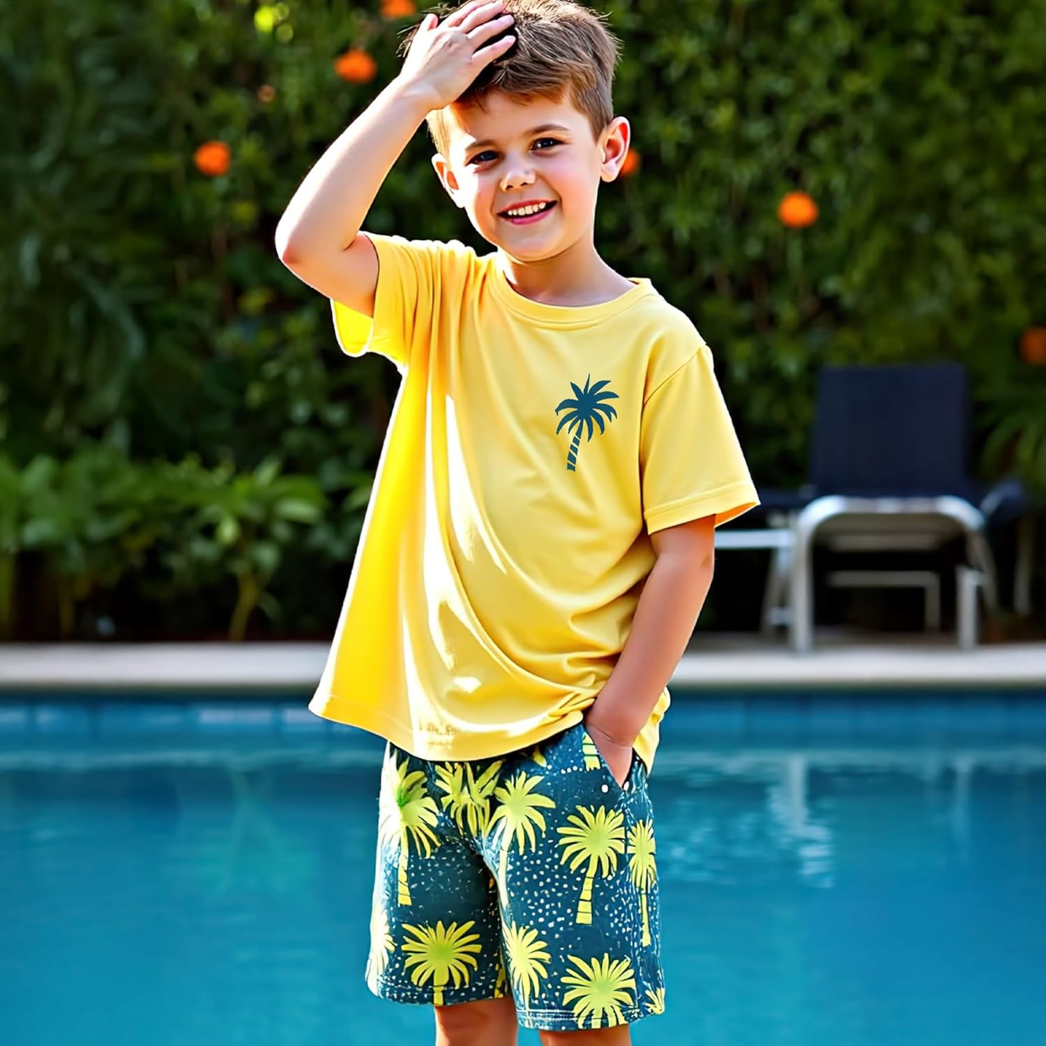 طقم تي شيرت وشورت للاولاد من زولينوفا، ملابس اطفال اولاد، ملابس صيفية للاولاد الصغار، ملابس صيفية بطبعة نخيل من قطعتين لعمر 4-7 سنوات