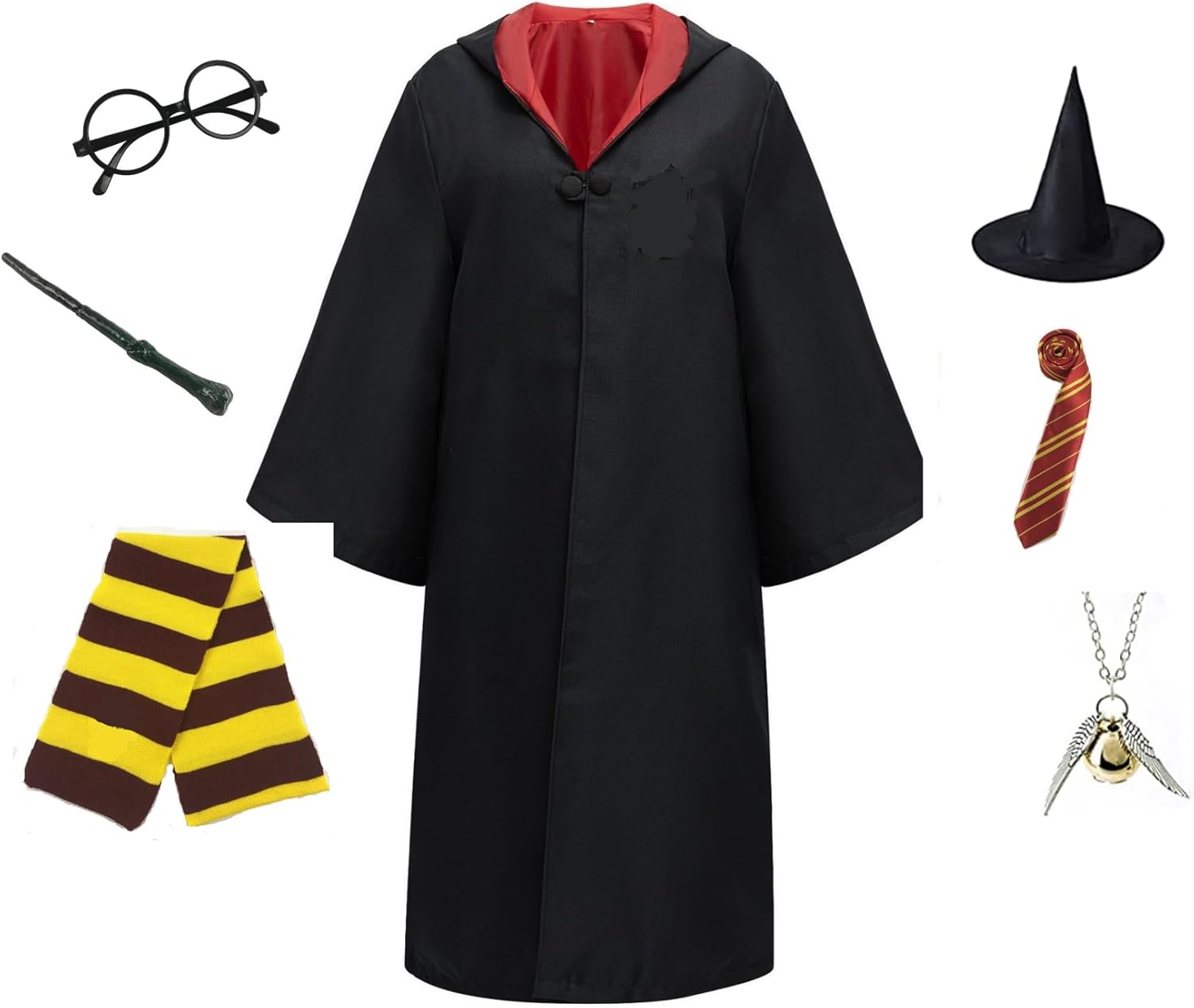 طقم زي الساحر السحري من 7 قطع للأولاد والبنات والمراهقين والبالغين، مجموعة إكسسوارات تنكرية بجودة الأفلام، مقاس 115-185 سم