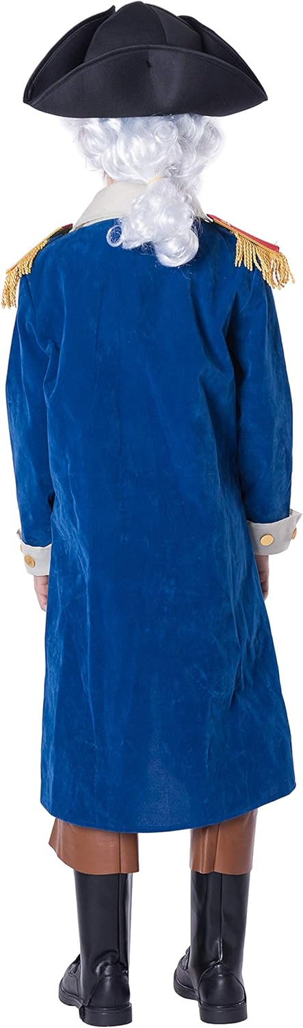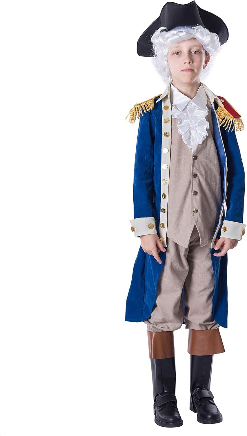 لماذا لا ترتدي طفلك زي جورج واشنطن الكلاسيكي الرائع والرائع؟ مجموعة أزياء جورج واشنطن الفاخرة للأطفال. يتميز بجاكيت طويل وسترة مع قميص متصل وقماش جابوت، وزوج من السراويل الداخلية مع أغطية للحذاء وقبعة وشعر مستعار!