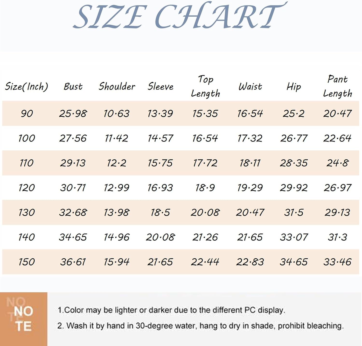 المقاس: 9-10 سنوات الصدر (الجزء العلوي): 84 سم/33.07 إنش الكتف(الجزء العلوي):36سم/14.17 إنش الكم (البلوزة):47سم/18.50 إنش الطول(البلوزة):54سم/21.26 إنش الخصر (السروال):54سم/21.26 إنش الأرداف (السروال):84 سم/33.07 الطول (السروال): 78 سم/30.71 انش