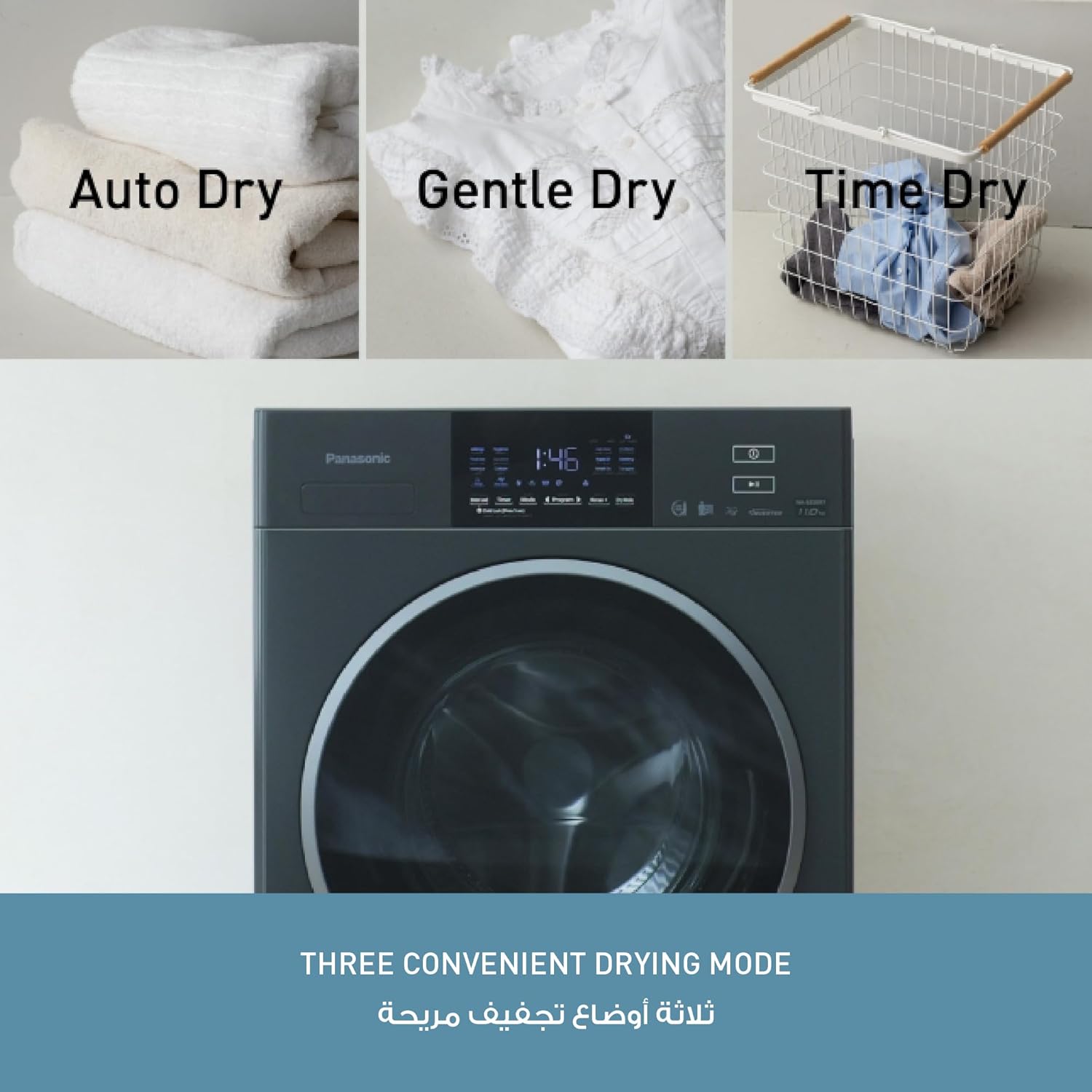 غسالة باناسونيك بتحميل أمامي سعة 11 كيلو غرام مع مجفف 7 كيلو غرام، كفاءة 5 نجوم في استخدام الماء والطاقة، غسل الثوب والعباية، تقنية إيكونافي، حماية مضادة للبكتيريا لمدة 18 ساعة، غسل سريع، غسالة ومجفف