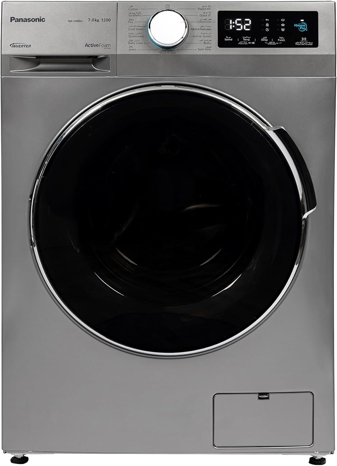 غسالة ومجفف بتحميل أمامي 7 كغم فضي من باناسونيك، لغسيل العباية/الملابس الرقيقة/نظام الرغوة النشطة، بسرعة نشطة/مع عاكس/إيقاف وإضافة – NA-14MG1LAE