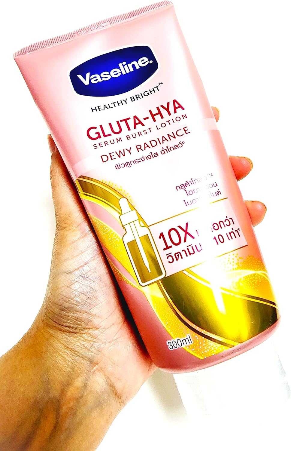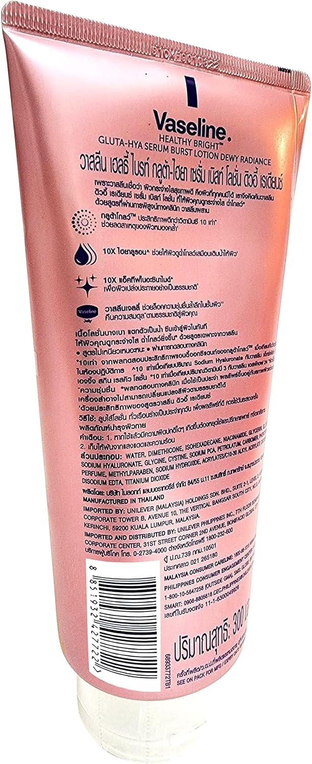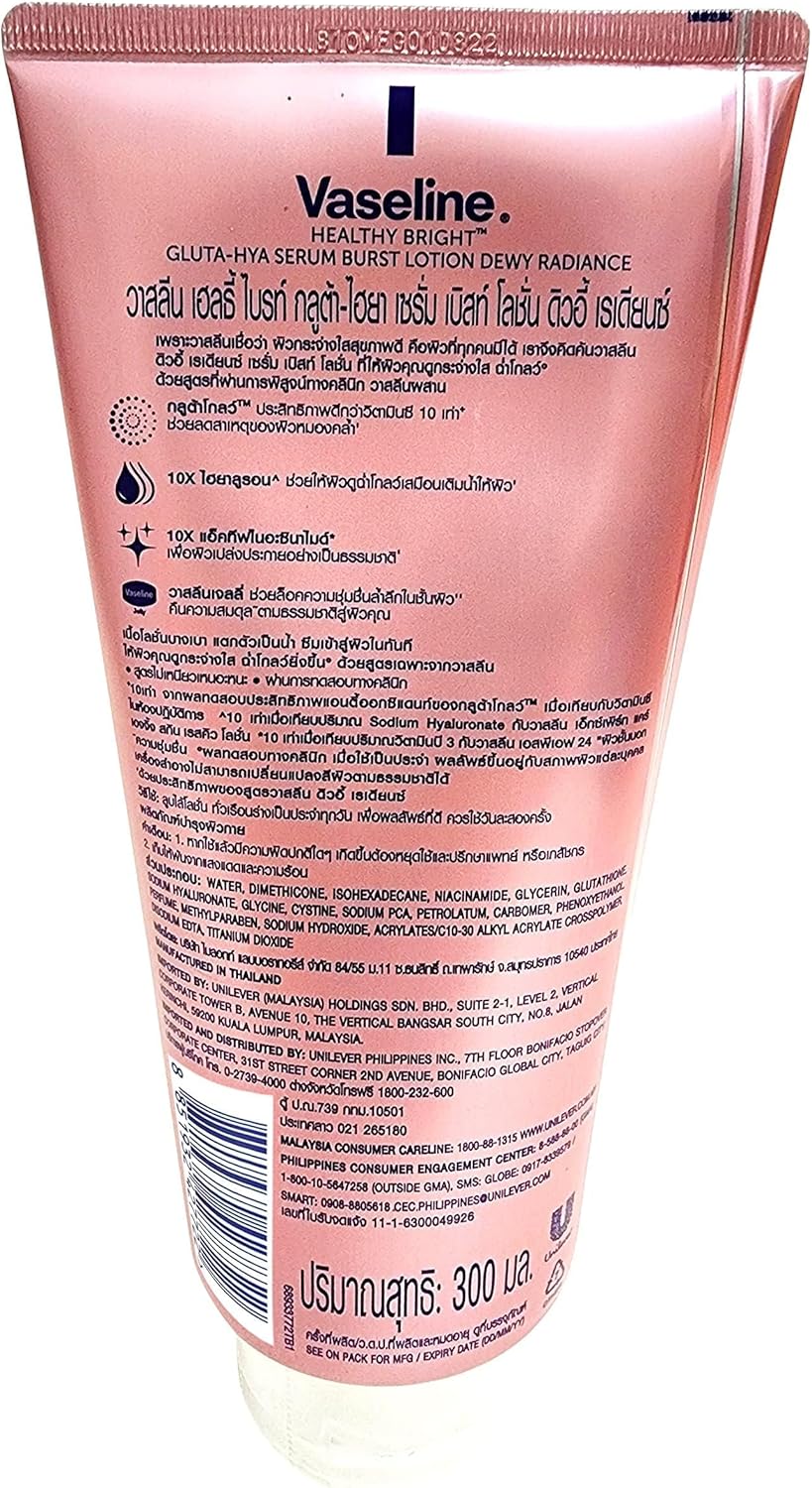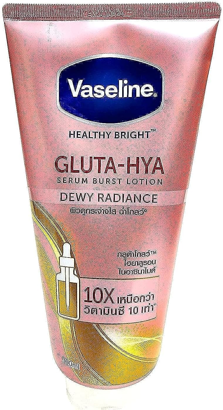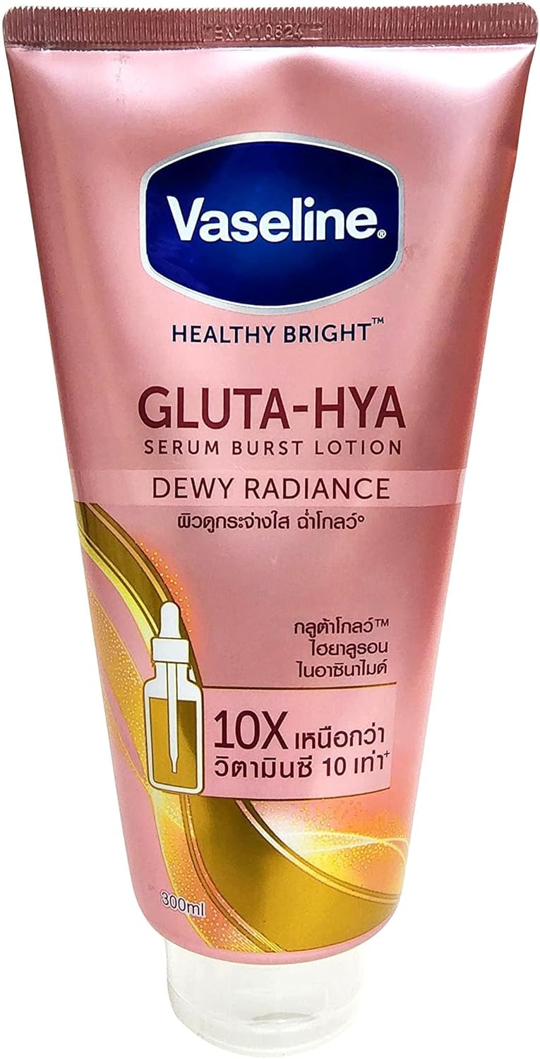 فازلين لوشن سيروم بيرست من جلوتا-هيا أفضل 10 مرات من فيتامين سي ليمنحك بشرة مشرقة وندية’- أول لوشن مصل مركز على الإطلاق من الفازلين – قوة أكثر إشراقًا 10 مرات من فيتامين سي – يحتوي على جلوتا جلو وهيالورون للحصول على بشرة ندية مشرقة.