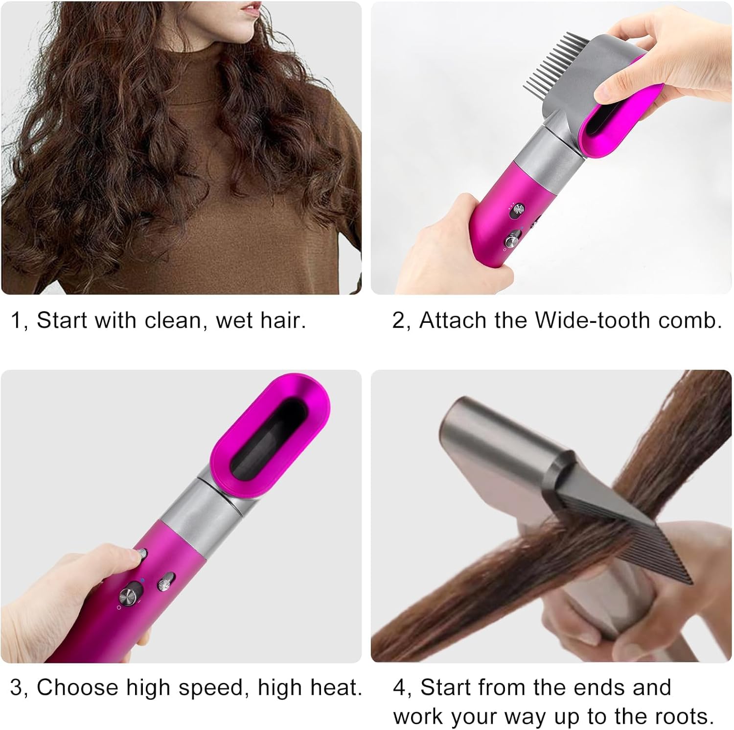 ✅خطوات الاستخدام: 1. قم بتقسيم شعرك إلى 4-6 أقسام. 2. قم بتركيب مشط الأسنان العريض، واضبطه على حرارة عالية وتدفق متوسط. 3. ابدأي من الأطراف، واعملي على تجفيف كل قسم حتى يصبح جافًا ومنزوع التشابك. 4. كرر العملية المذكورة أعلاه حتى يكتمل كل قسم. 5. عندما يتم إطالة نمط الضفائر، ضعي سيروم خفيف الوزن. 6. لإكمال الضغط الحريري، استخدم مكواة الشعر لفرد شعرك.