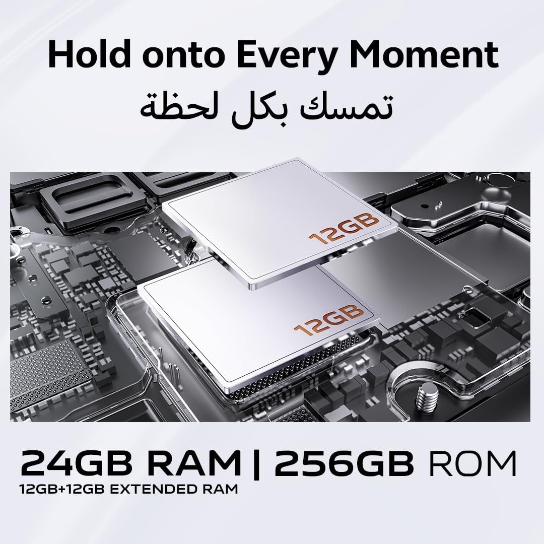 أداء لا مثيل له مع ذاكرة رام 12 جيجابايت + 12 جيجابايت ممتدة: قم بتشغيل تطبيقات متعددة بسلاسة مع ذاكرة رام ضخمة بسعة 12 جيجابايت، وقم بتمديدها بمقدار 12 جيجابايت أخرى لتعدد المهام أكثر سلاسة