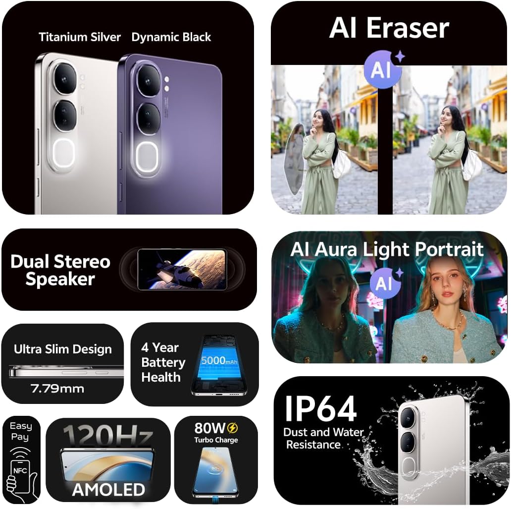 فيفو V40 لايت 5G (اسود ديناميكي، ذاكرة RAM 12GB، 256GB) | شاشة AMOLED 120Hz | كاميرا سيلفي 32MP | بطارية 5000Ah | IP64 – اصدار الشرق الاوسط