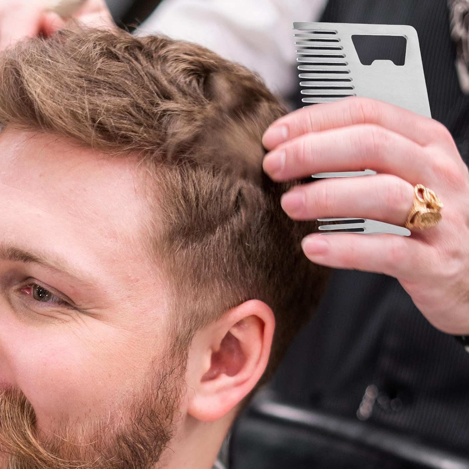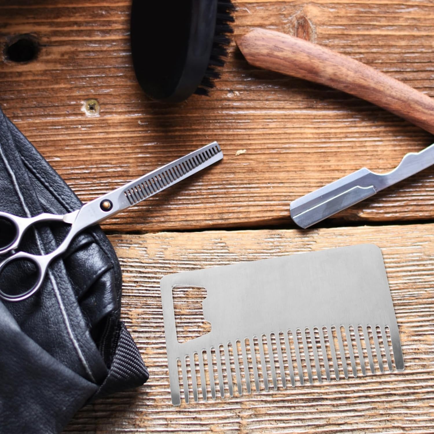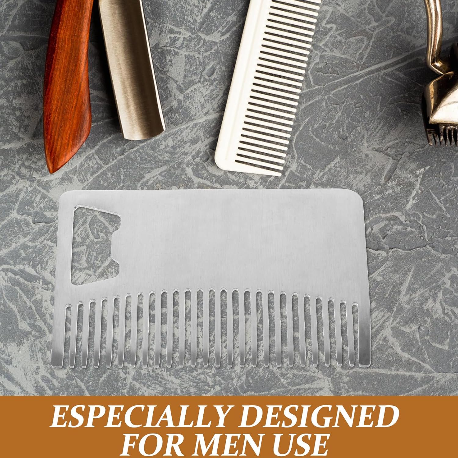 مشط متعدد الوظائف لبطاقات الائتمان: يتميز هذا المشط المصنوع من الستانلس ستيل للشعر واللحية بفتاحة زجاجات مدمجة، تجمع بين العناية والفائدة العملية في تصميم صغير بحجم بطاقة الائتمان مثالي للرجال الذين يبحثون عن الراحة والكفاءة