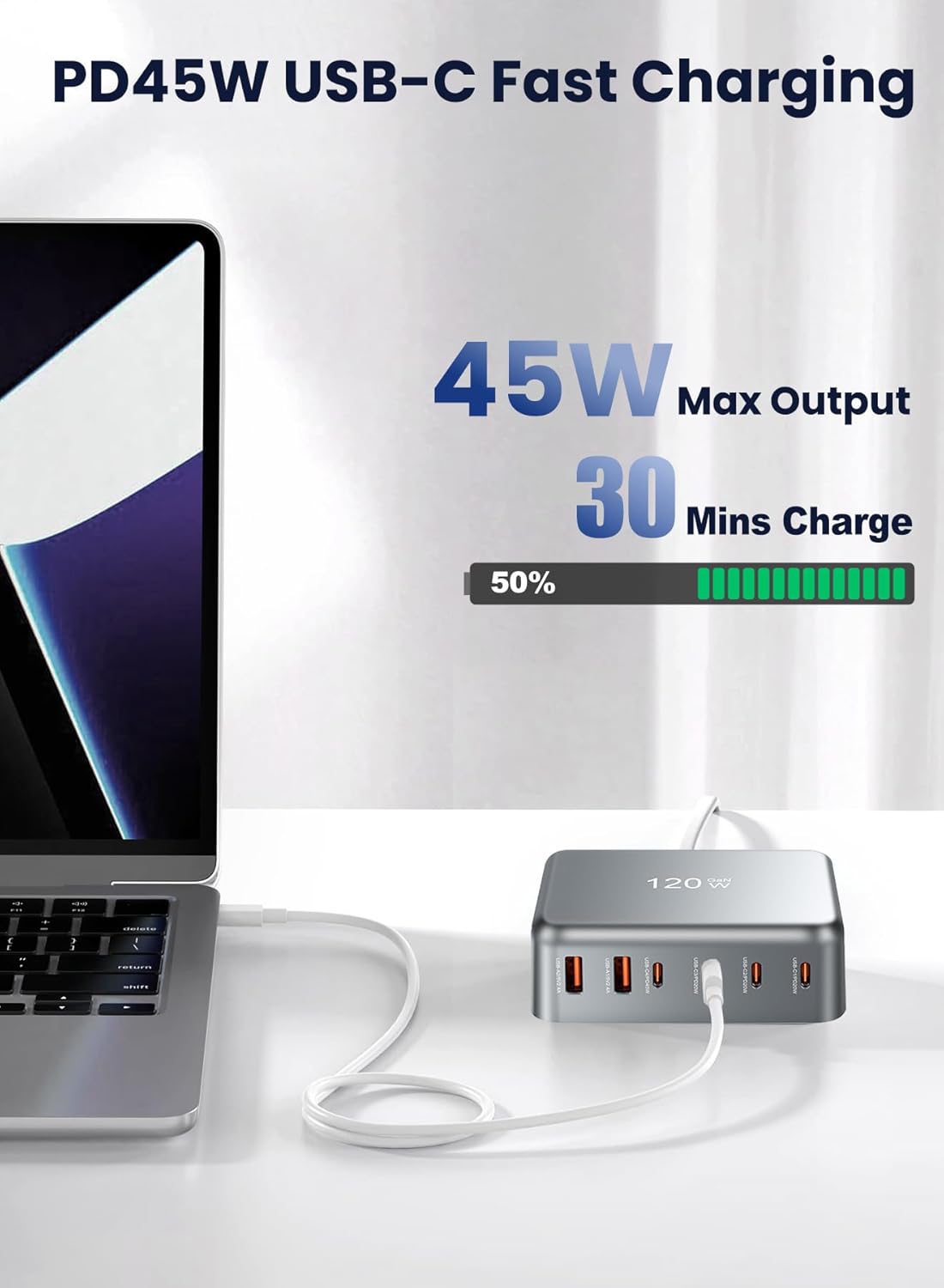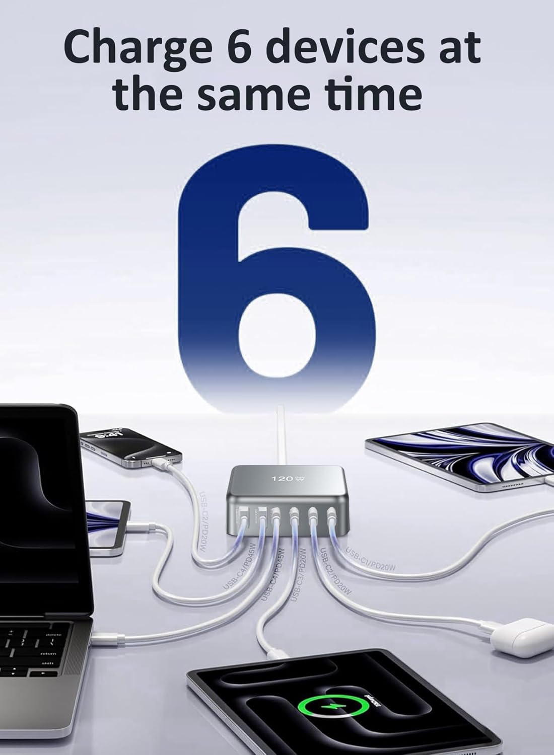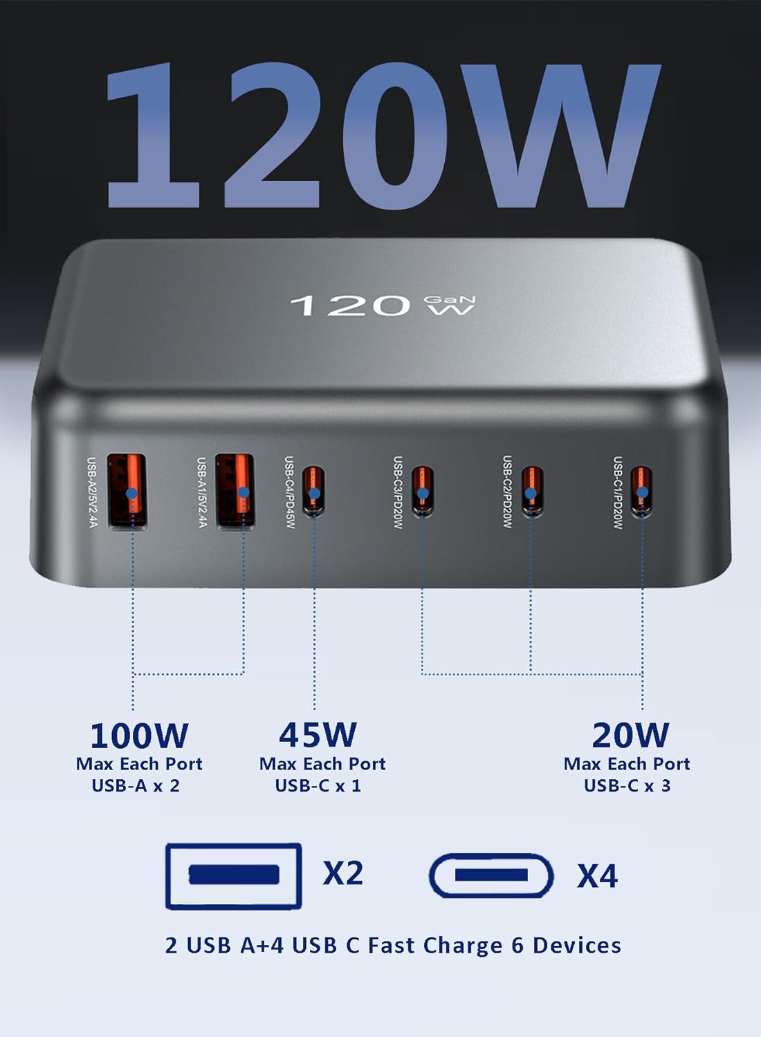 【خرج طاقة إجمالي 120 واط】تتيح تقنية جان سعة شحن مدمجة 120 واط لتشغيل 6 أجهزة في وقت واحد بأقصى قدر من الكفاءة للإعدادات المكتبية أو الاستخدام العائلي