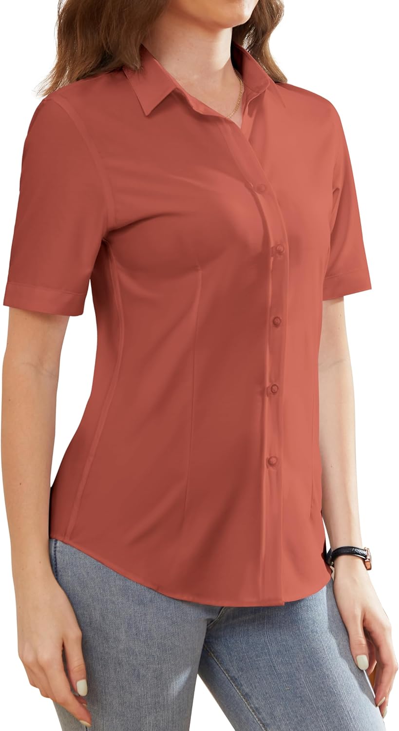 قمصان رسمية للنساء خالية من التجاعيد بازرار سفلية قصيرة الاكمام قميص عمل بياقة للنساء