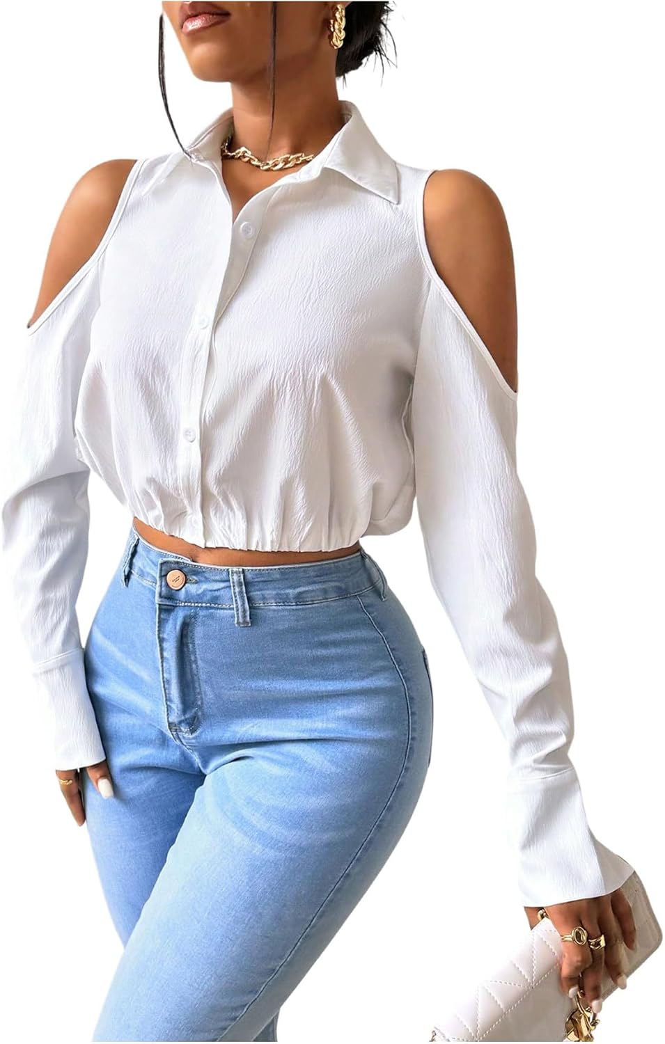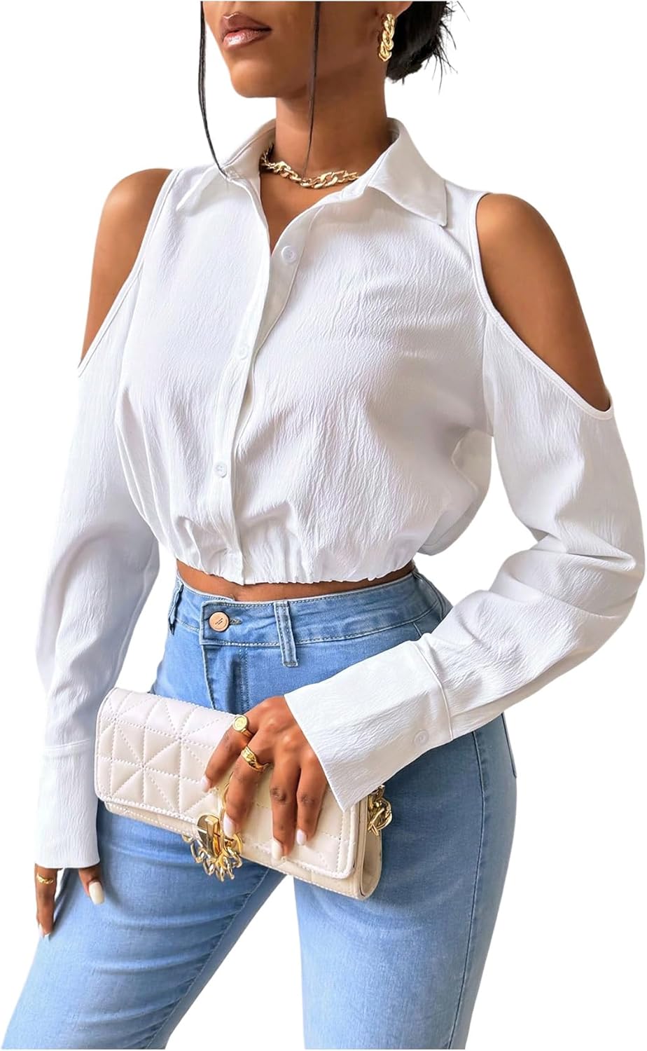قمصان نسائية قصيرة بأكمام طويلة مكشوفة الكتفين من جورجليتر، قمصان أنيقة بياقة وازرار