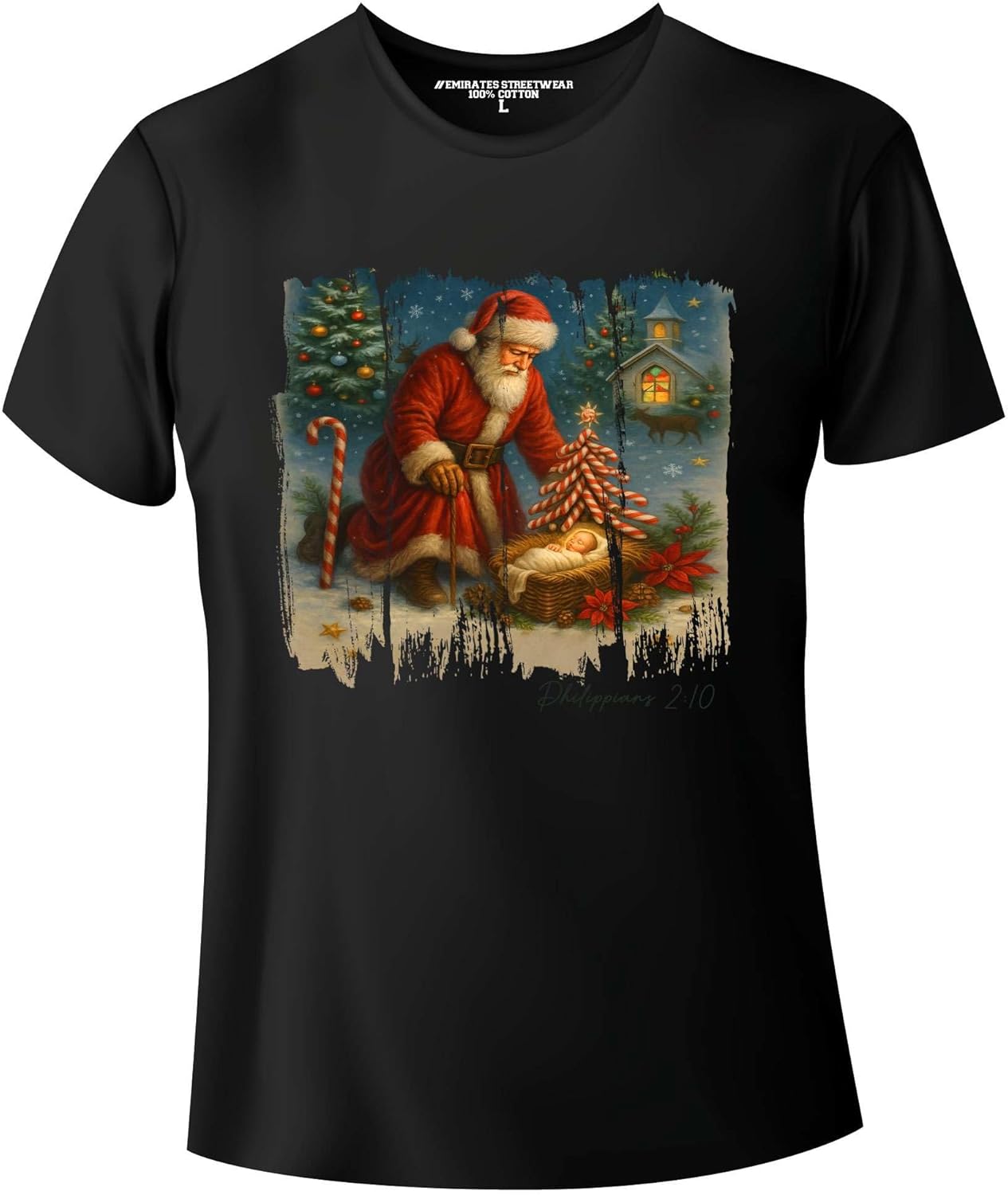 قميص بعبارة «Every Knee Shall Bow» – سانتا راكعين قبل الطفل يسوع – فيلبي 2:10 كريستيان كريسماس للرجال والنساء والأطفال، تي شيرت أسود للجنسين، D-0109