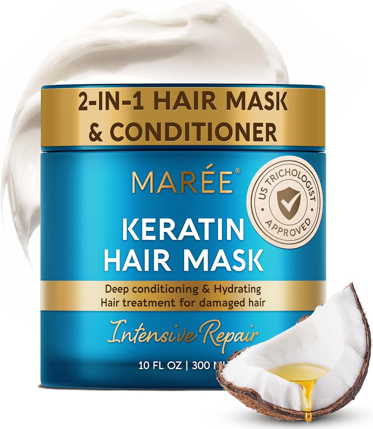 قناع الشعر المرطب العميق للشعر الجاف التالف والنمو: علاج الشعر بالكيراتين من ماري غني بالكيراتين والبيوتين وزيت جوز الهند للحصول على شعر ناعم ولامع. بلسم وقناع الشعر الخاص بنا للشعر المجعد يرطب ويصلح بشكل أفضل من زيت الأرغان!