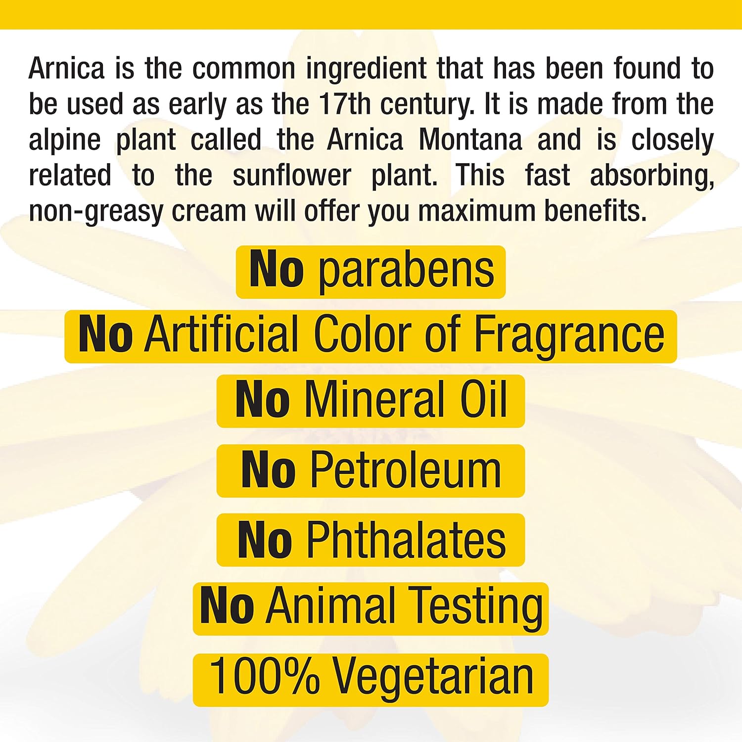 مكونات عالية الجودة: لا يحتوي كريم أرنيكا ريل ريليف على البارابين أو اللون الاصطناعي أو العطر أو الزيوت المعدنية أو البترول أو الفثالات أو المختبر على الحيوانات وهو نباتي بنسبة 100%.