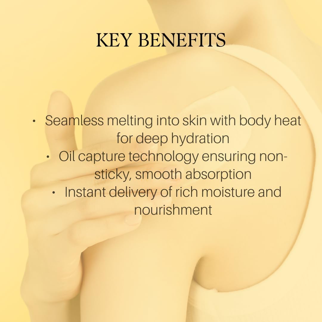 تقنية التقاط الزيت: يذوب في درجة حرارة الجسم للحصول على ترطيب غني غير لزج يمتص بسرعة مع ترك البشرة ناعمة ومخملية.
