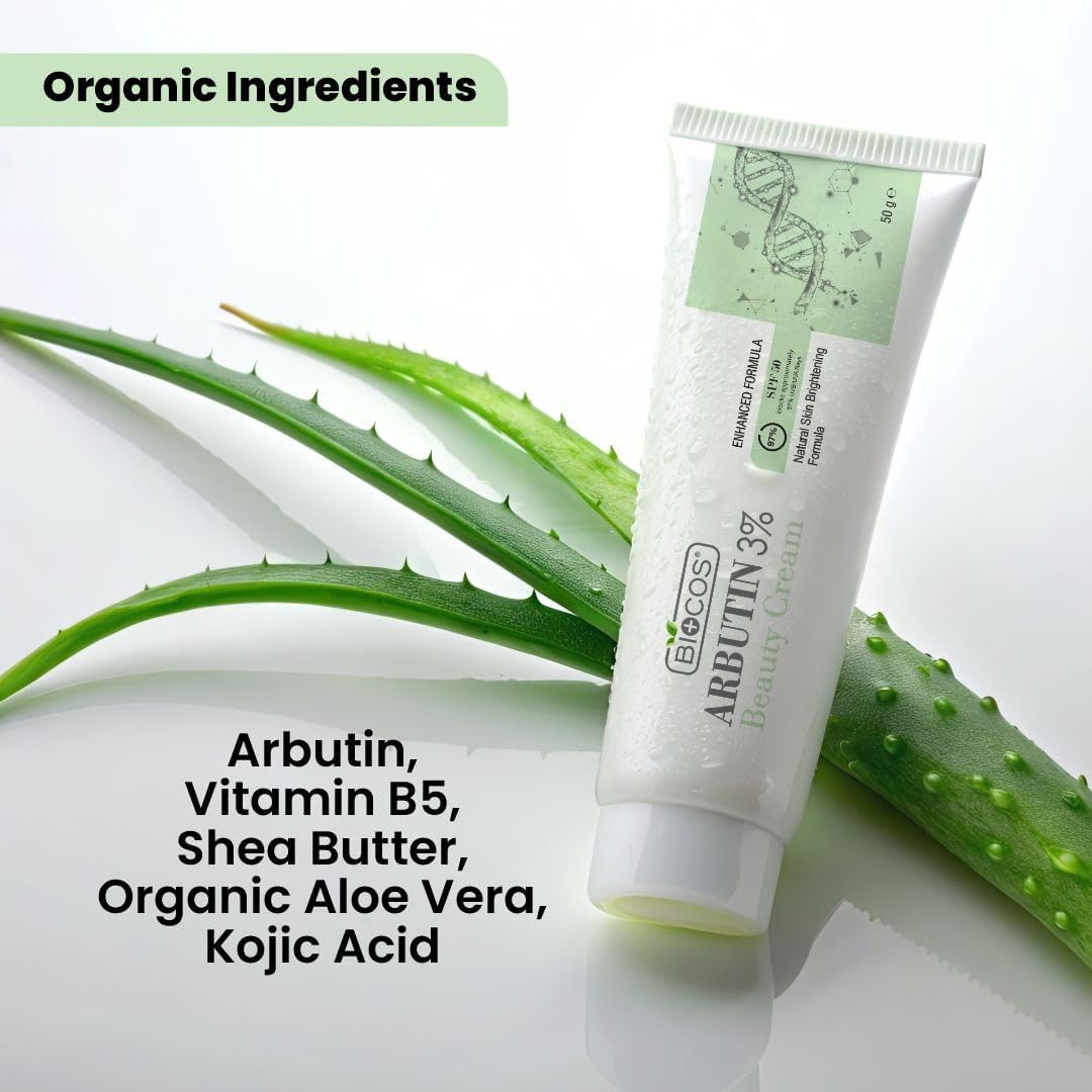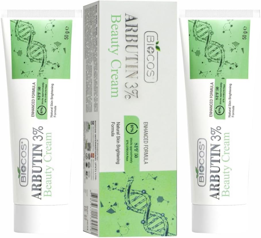 كريم وجه اربوتين 3% للبقع الداكنة وتسمير الشمس (عبوة من قطعتين) مع حمض الجليكوليك والكوجيك للعيوب والبقع الداكنة – فيتامين B5 ومستخلص عرق السوس بعامل حماية من الاشعة فوق البنفسجية 50 من بيوكوس – 50