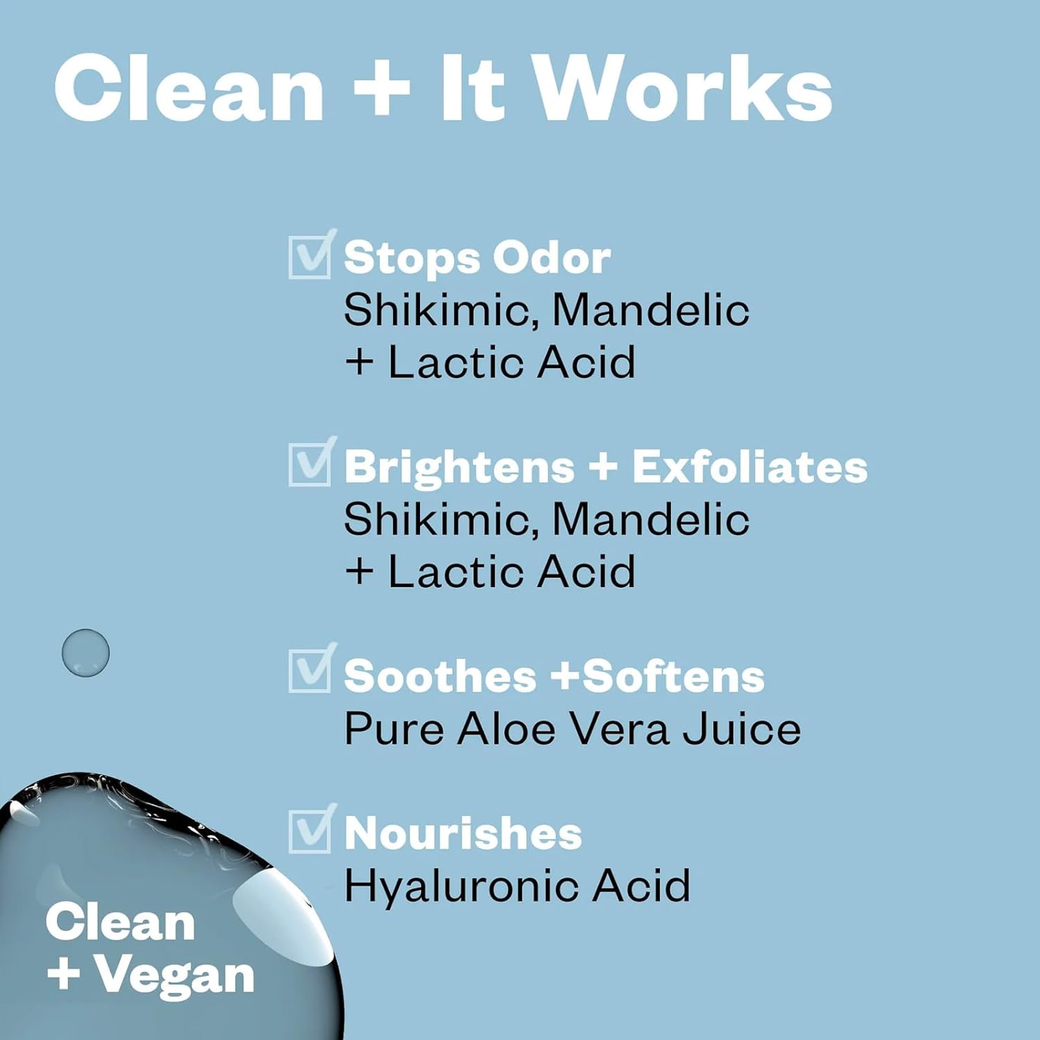 عناية فعالة + نظيفة بالبشرة – نريد علاج رائحة الجسم من مصدرها. تم اختباره سريريًا وآمن على البشرة الحساسة.