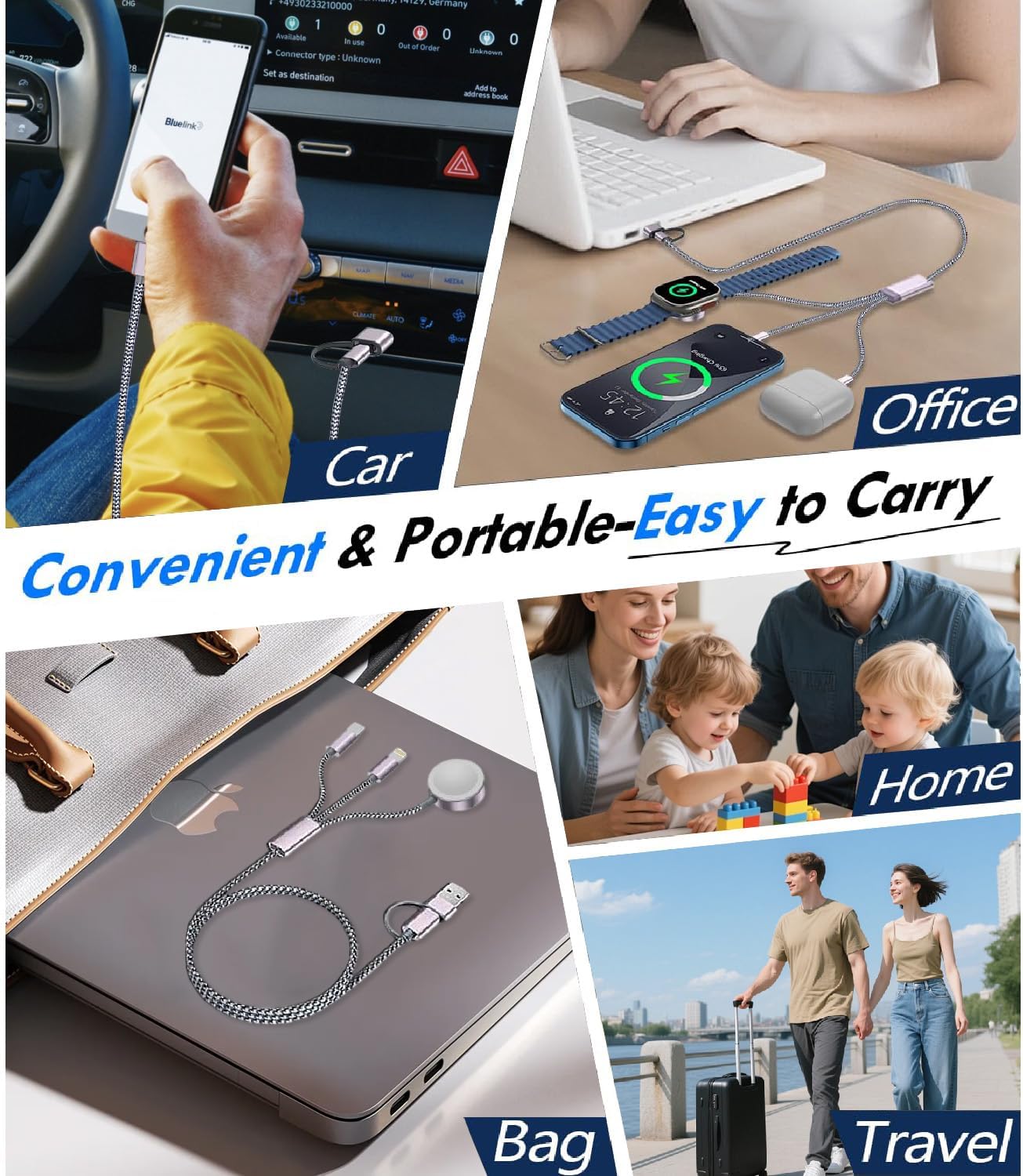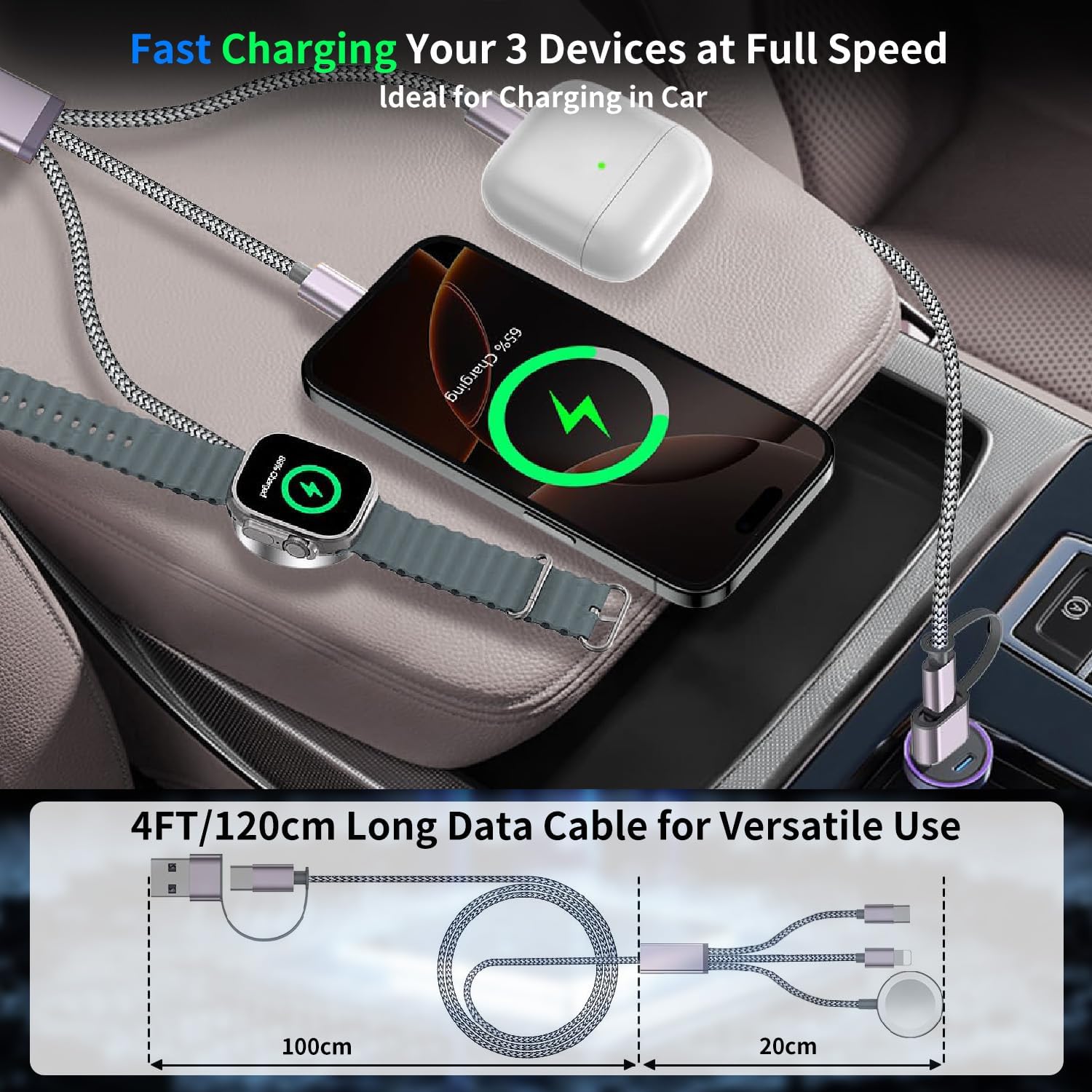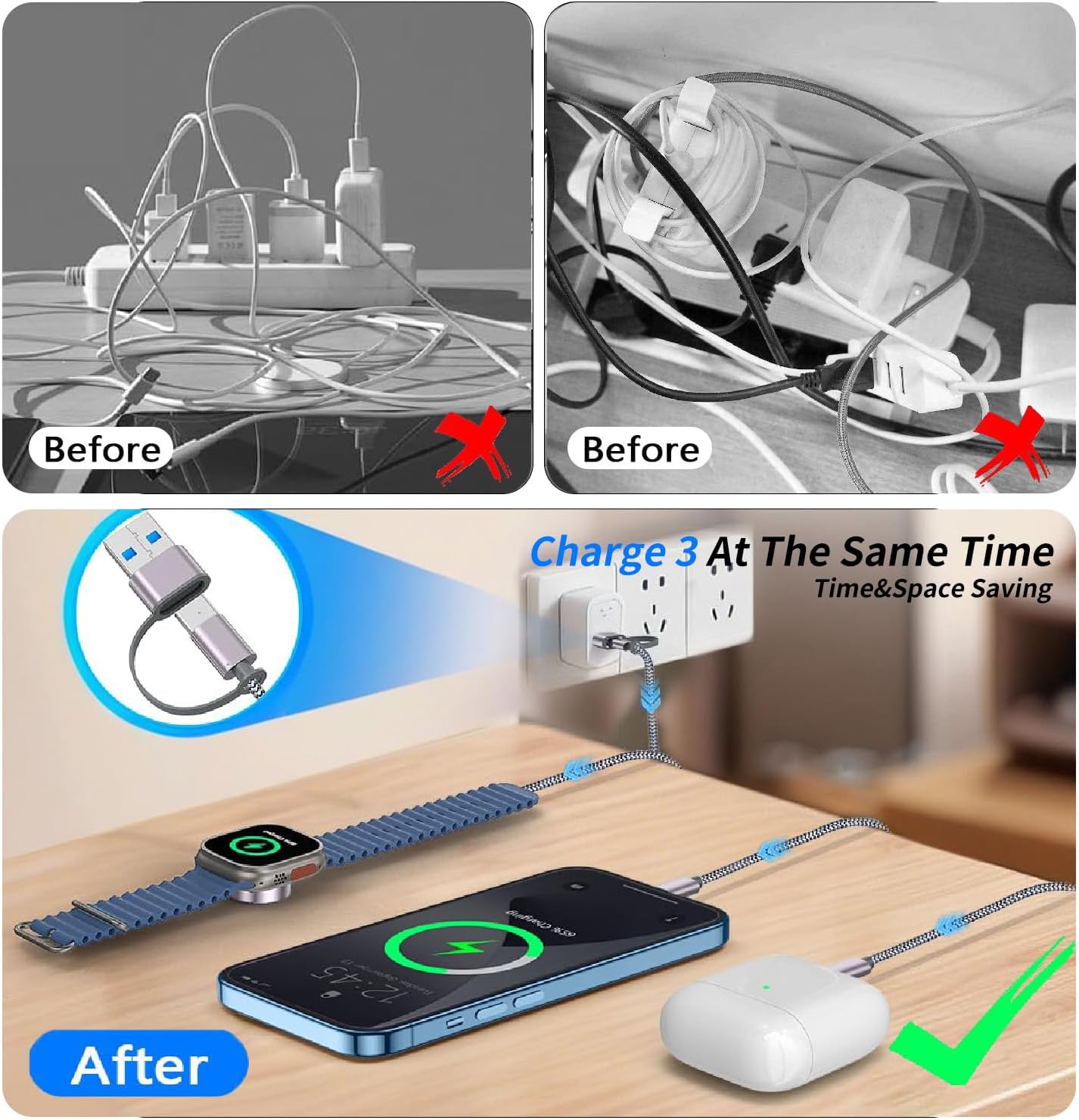 【أساسيات السفر المحمولة】كيبل الشحن 3 في 2 بطول 1.2 متر/4 قدم مريح للحمل مع تصميم خفيف الوزن ومحمول. يناسب شنطة السفر الخاصة بك بسلاسة أثناء التنقل أو ببساطة استخدمه في المنزل والمكتب، اشحن ساعة ابل وايفون في أي مكان في أي وقت (ملاحظة: لا توجد حافظة اي ووتش لسرعة شحن أفضل)
