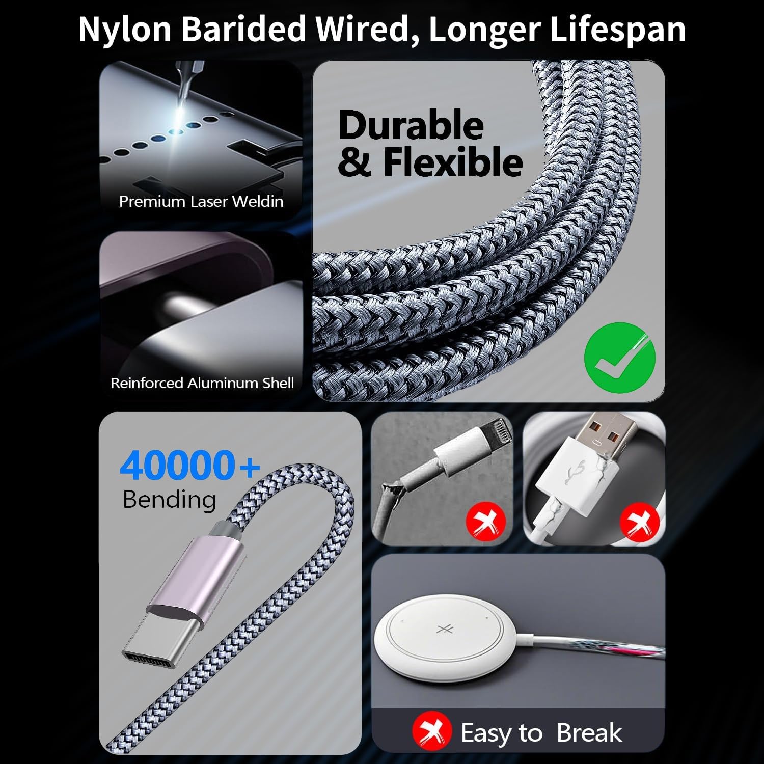 【مادة عالية الجودة】مصنوعة من 48 ضفيرة من النايلون المضفر وهيكل من خليط معدني من الألومنيوم، كابلات الشحن لأجهزة متعددة تقاوم الكسر والوبر والسحب. يضمن كيبل الشحن المتعدد متانة ومرونة تدوم طويلاً للاستخدام اليومي