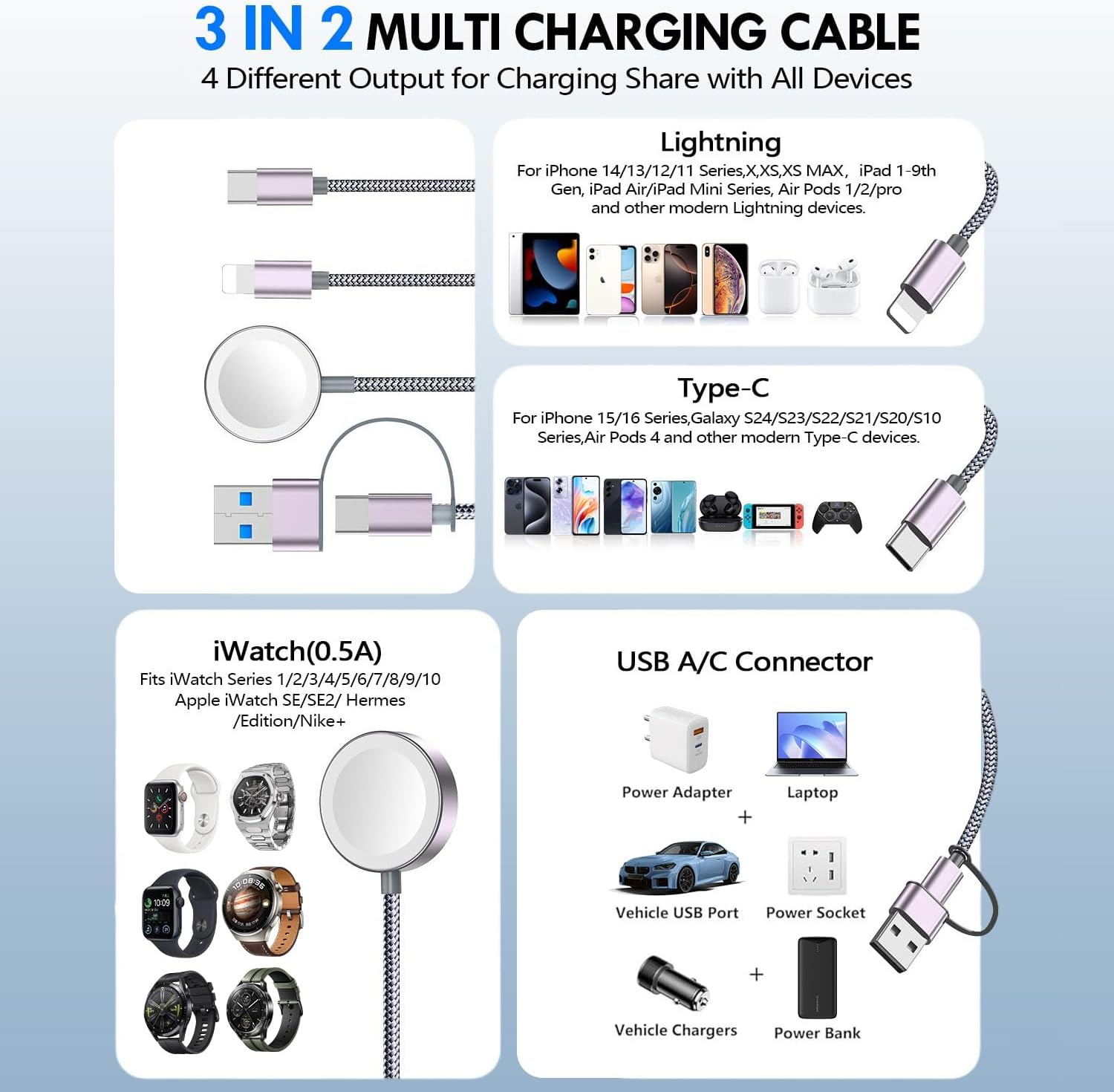 كيبل شحن سريع متعدد لشاحن ساعة ابل، شاحن ايفون، [اساسيات السفر 3 في 2] كيبل USB A/Type C/لايتنينج لساعة اي ووتش الترا/SE/10-2، ايفون 16-11، جالكسي S25-21، ايباد، 1.2 متر